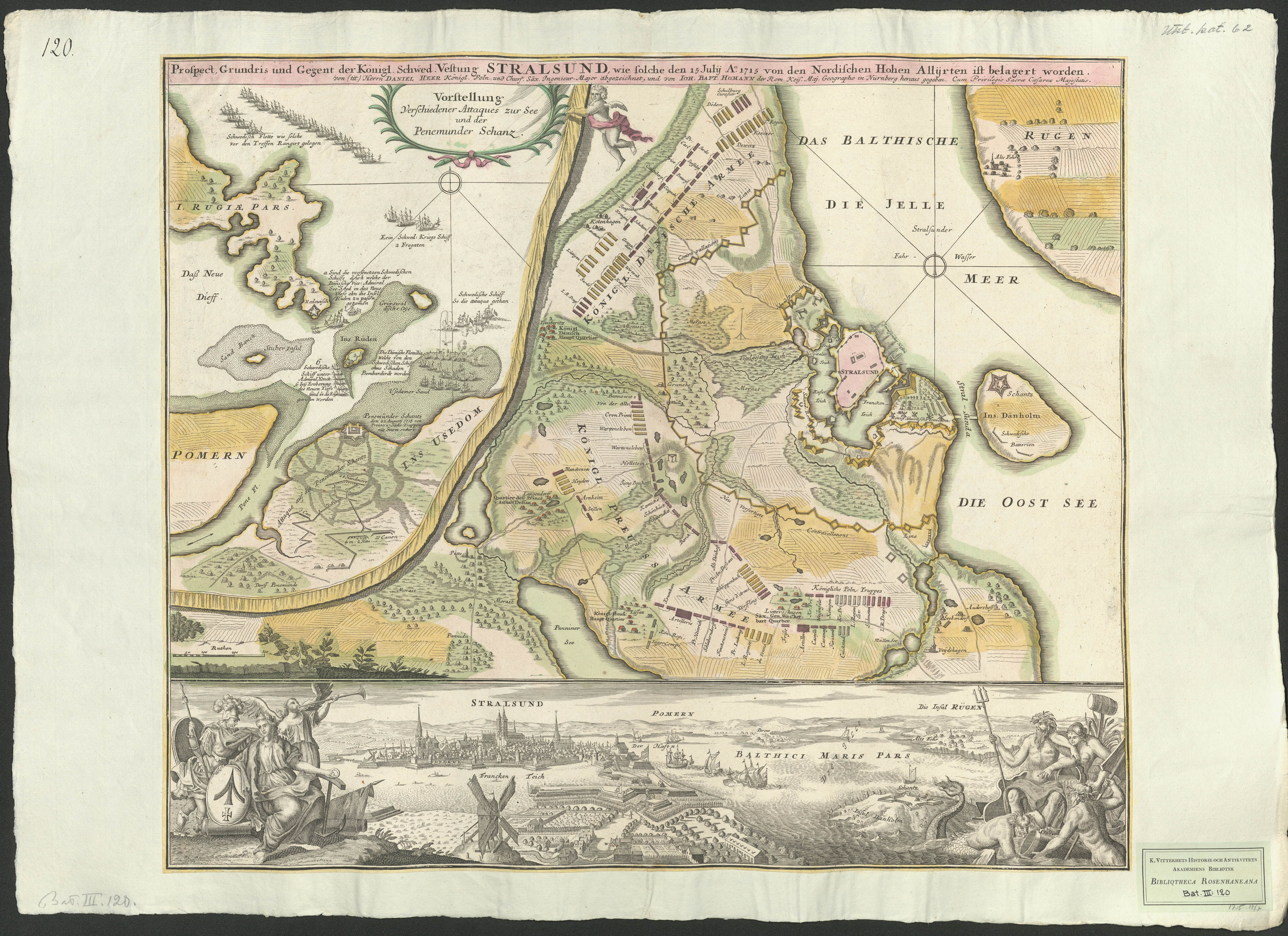 Prospekt, Grundriss und Gegent der Vestung Stralsund, wie solche d 15 julii 1715 von den Nordischen alierten ist belagert worden.[Bild]