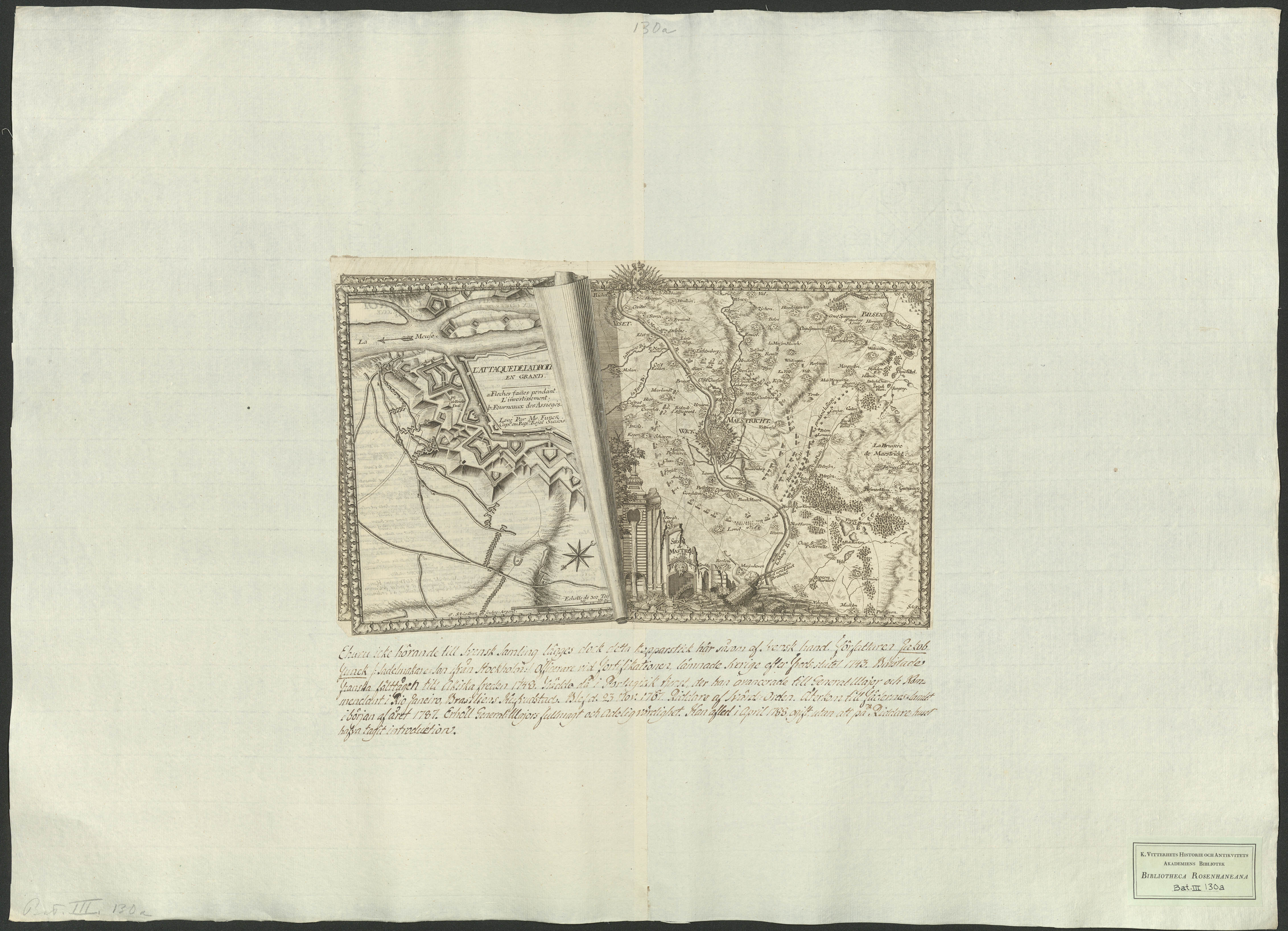 Beskrivning: 1 grafiskt bl. + Framsidan, två sidor: till vänster plan i lodperspektiv över fästningen. Till höger småskalig karta över området kring Maastricht.;Under det vändbara bladet till vänster: Kartor och slagordningar. Till höger tabell. Levé par Mr Funck ; Gravé par Jean Striedbeck a Strasbourg