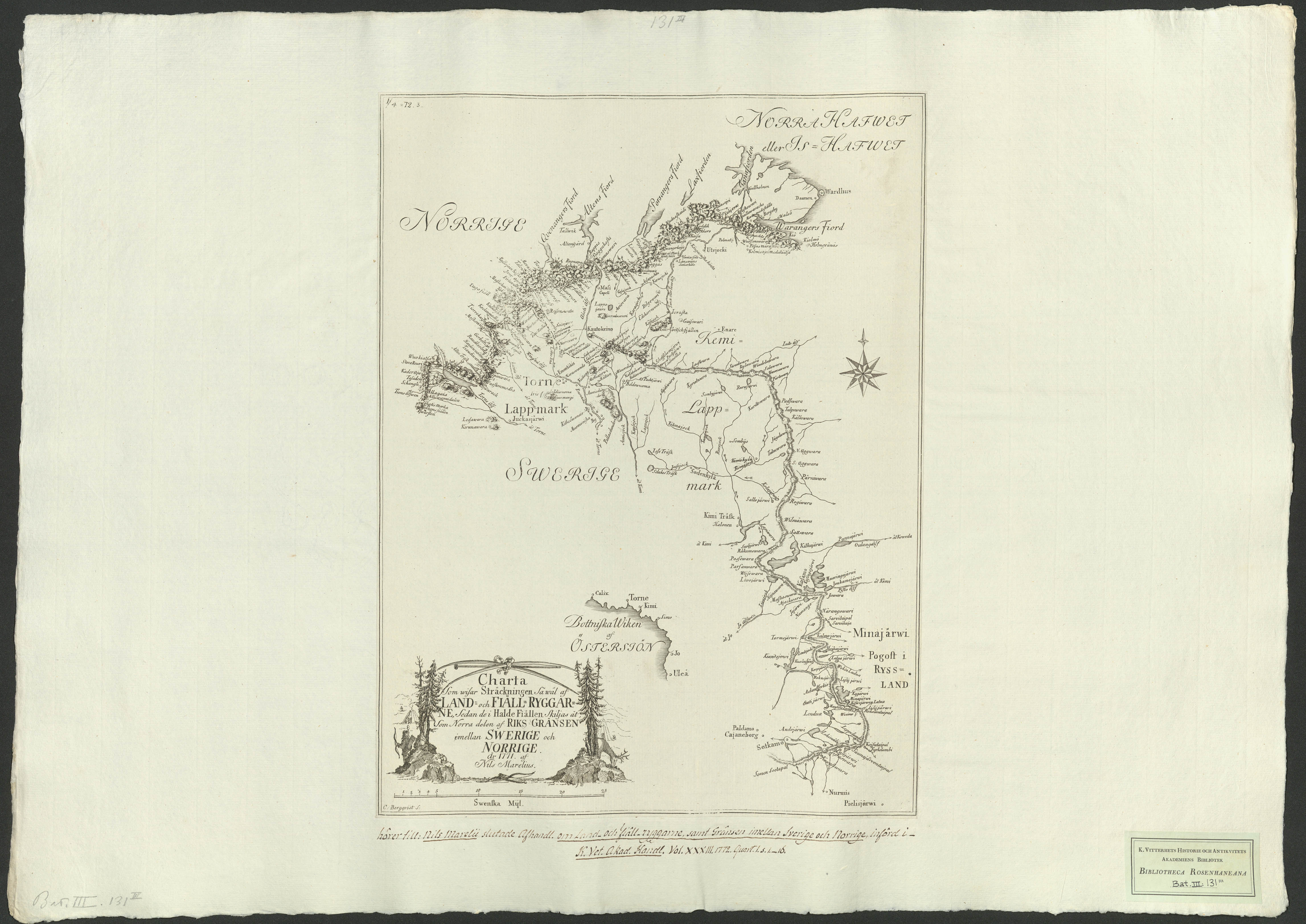 Charta som wisar sträckningen så wäl af land- och fiällryggarne, sedan de i Haldefiällen skiljas åt som norra delen af riksgränsen emellan Swerige och Norrige år 1771 af Nils Marelius..[Kartografiskt material]