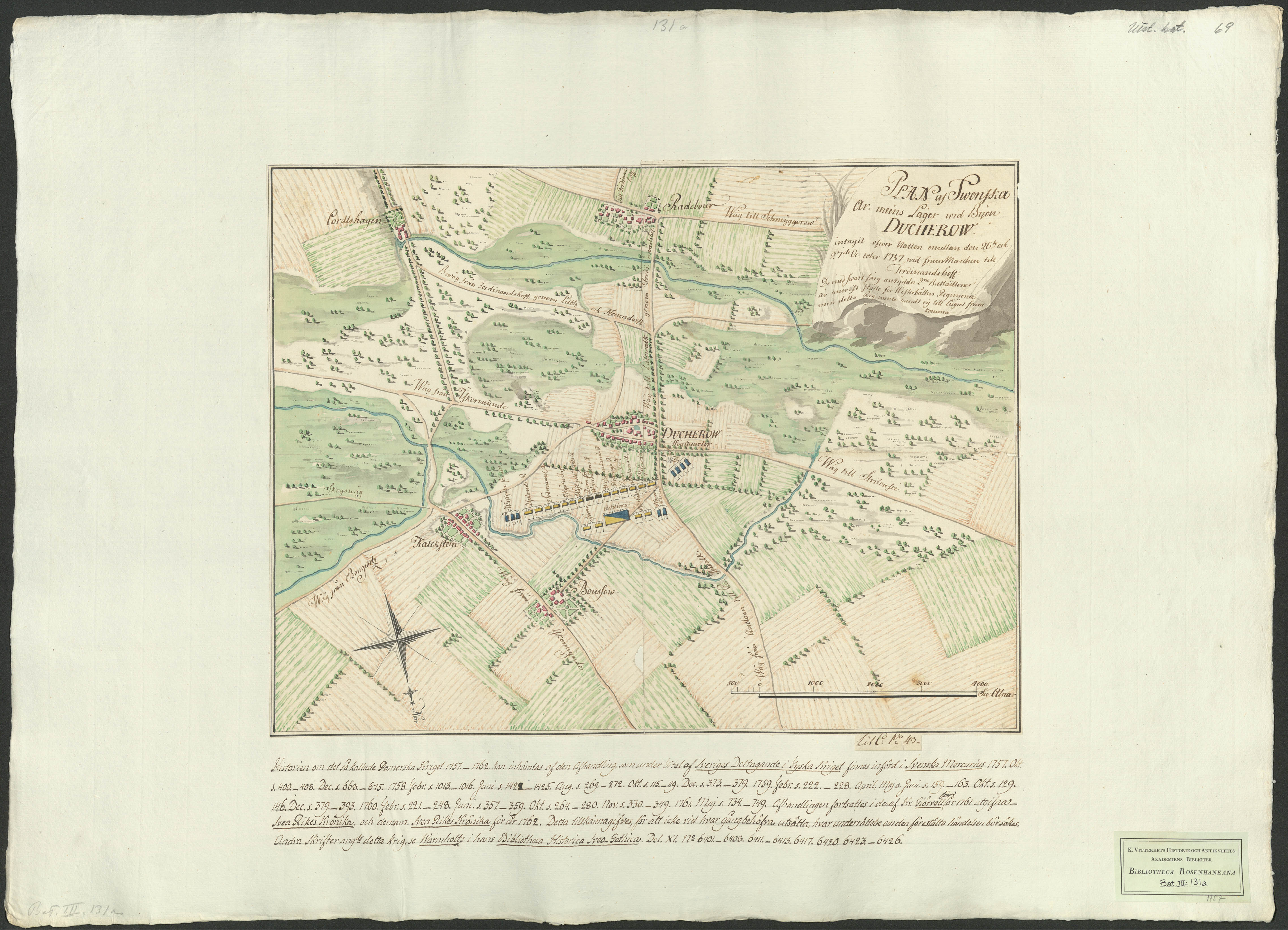 Plan af swenska arméens läger wid byen Ducherow, intagit öfwer natten emellan den 26:te och 27:de october 1757 wid frammarschen till Ferdinandshoff.[Kartografiskt material]