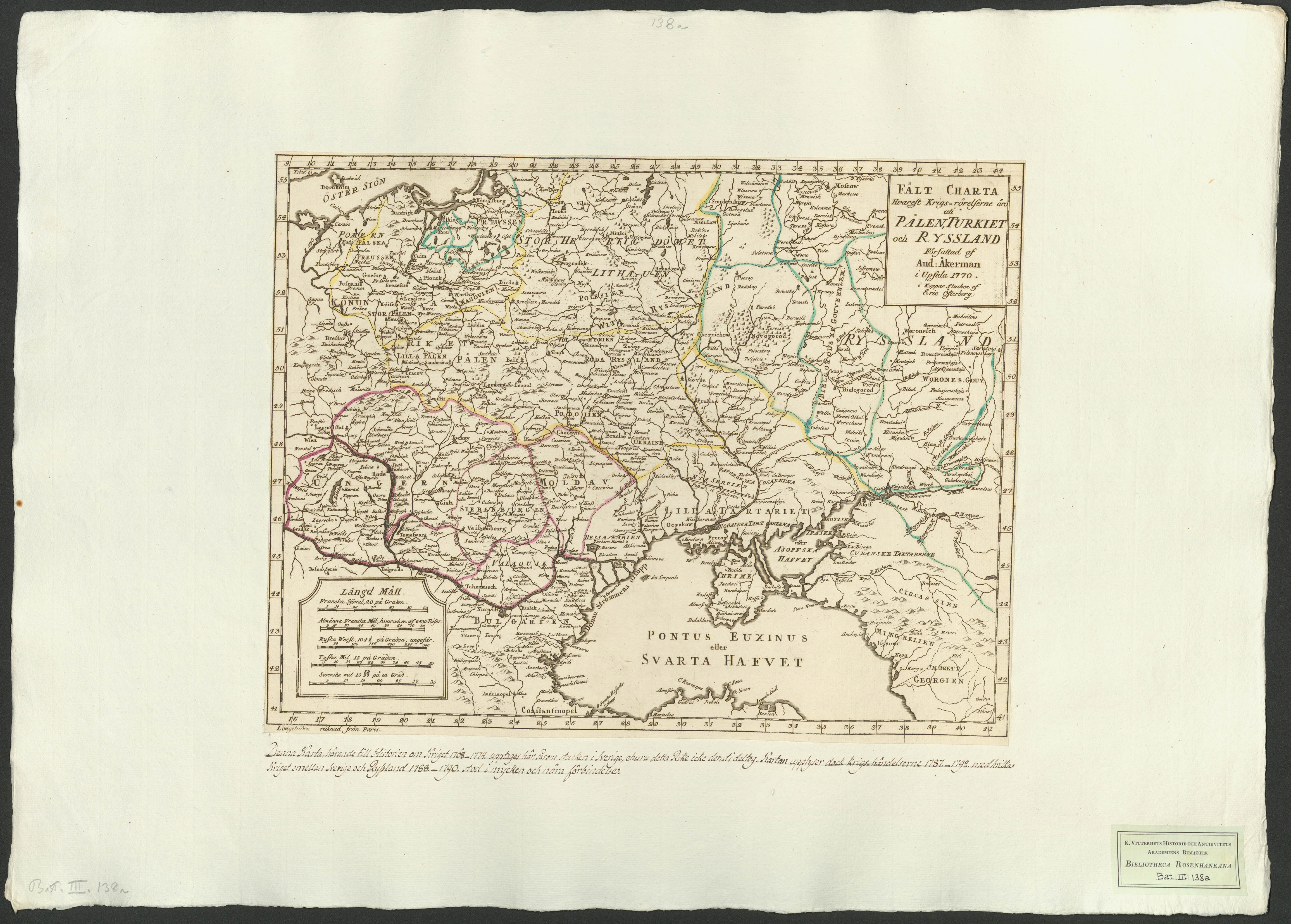 Beskrivning: 1 karta : Visar krigsrörelserna i olika färger, orter, vägar och vattendrag. Vissa enklare höjdmarkeringar. Författad af And. Åkerman i Upsala 1770 ; stucken af Eric Österberg