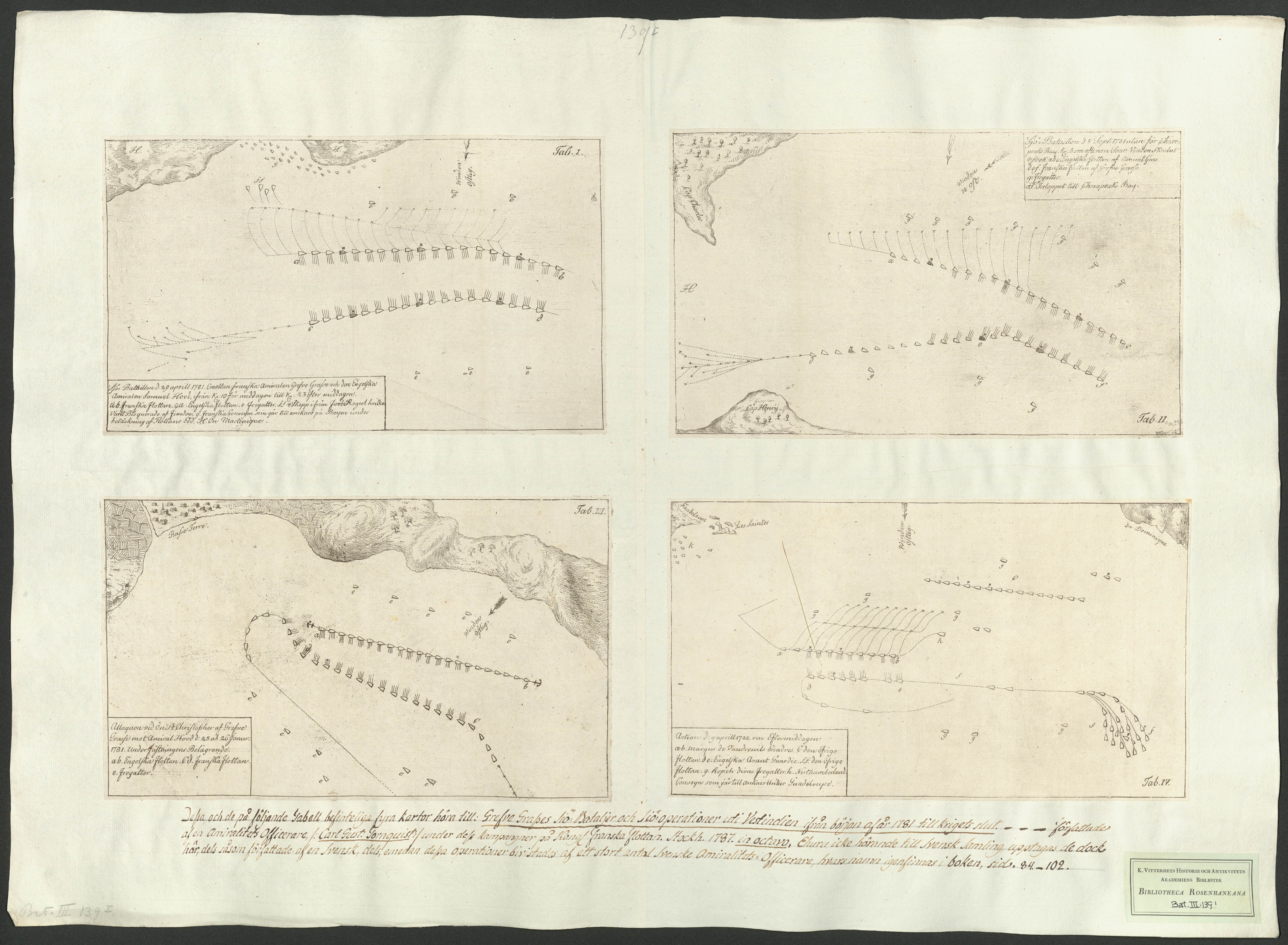 Beskrivning: 4 kartor : Fyra kartor/rekonstruktioner av sjöslag i Västindien mellan engelska och franska flottorna. Visar kustlinjer, vindens riktning samt fartygens positioner.
