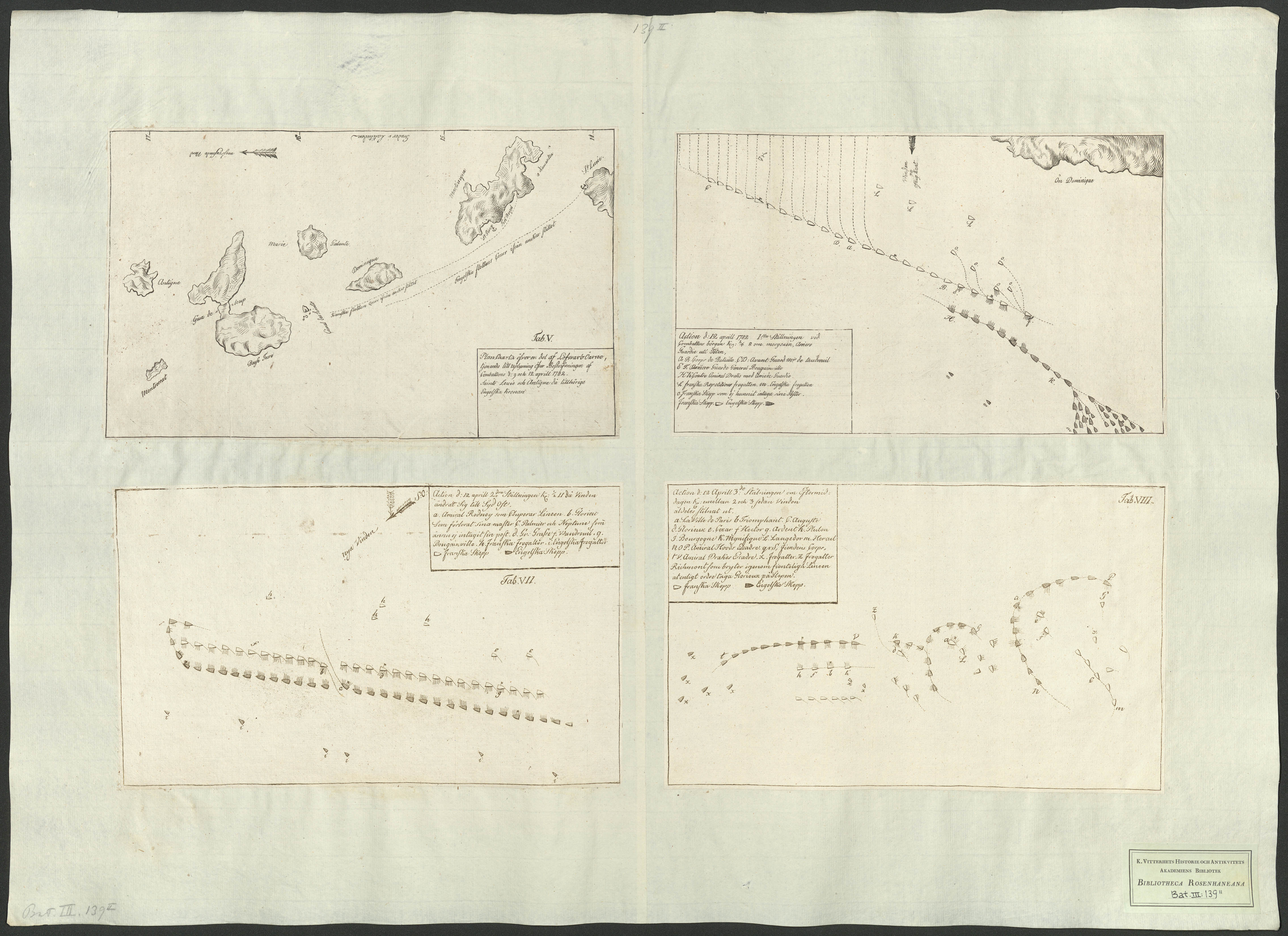 Beskrivning: 4 kartor : Fyra kartor/rekonstruktioner av sjöslag i Västindien mellan engelska och franska flottorna. Visar kustlinjer, vindens riktning samt fartygens positioner.