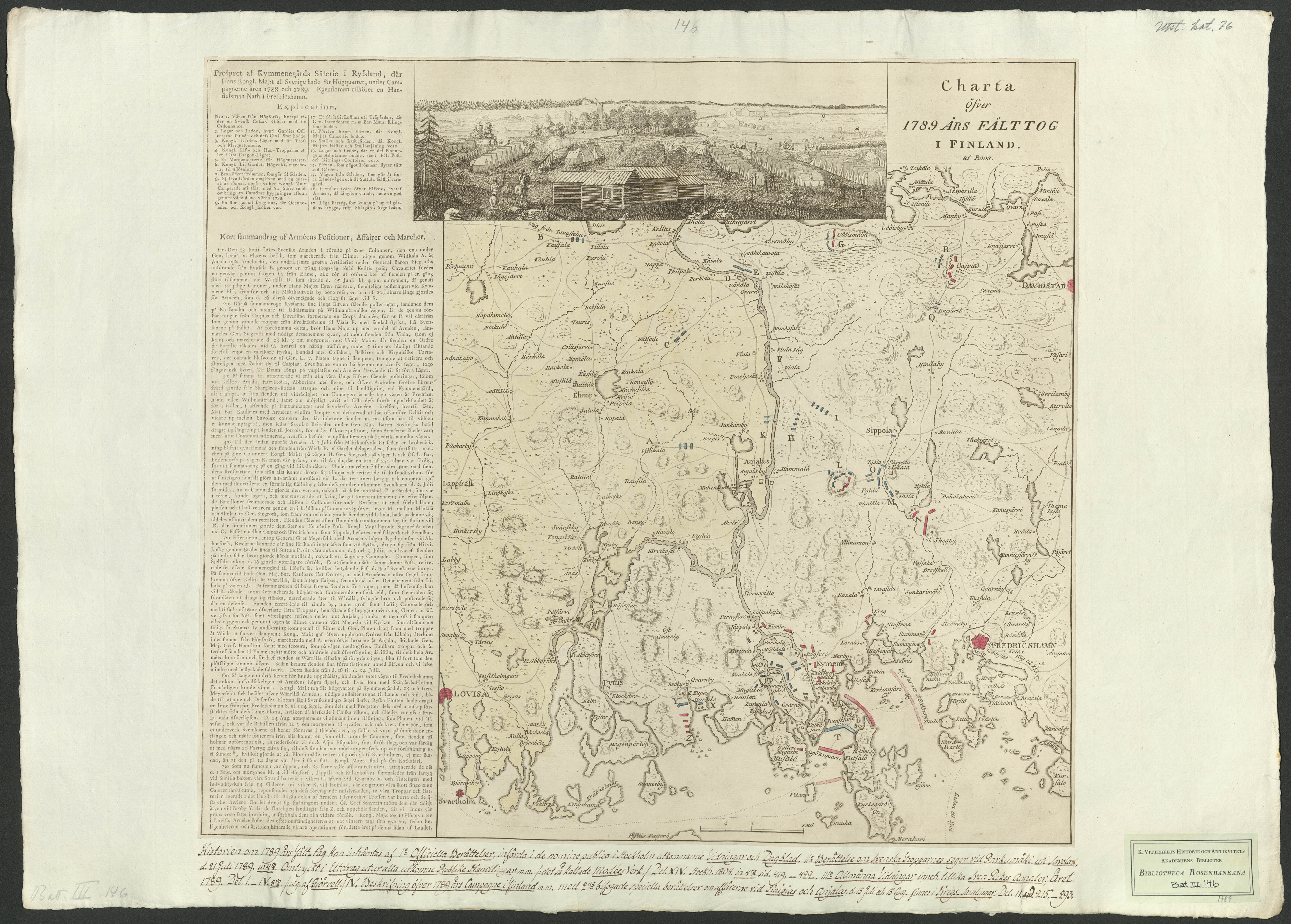 Beskrivning: 1 grafiskt bl. : Visar respektive arméers ställningar vid olika tillfällen. Även orter, viss topografi samt vattendrag. Överst en teckning över Kymmene gård. I vänsterkant beskrivande text. af Roos