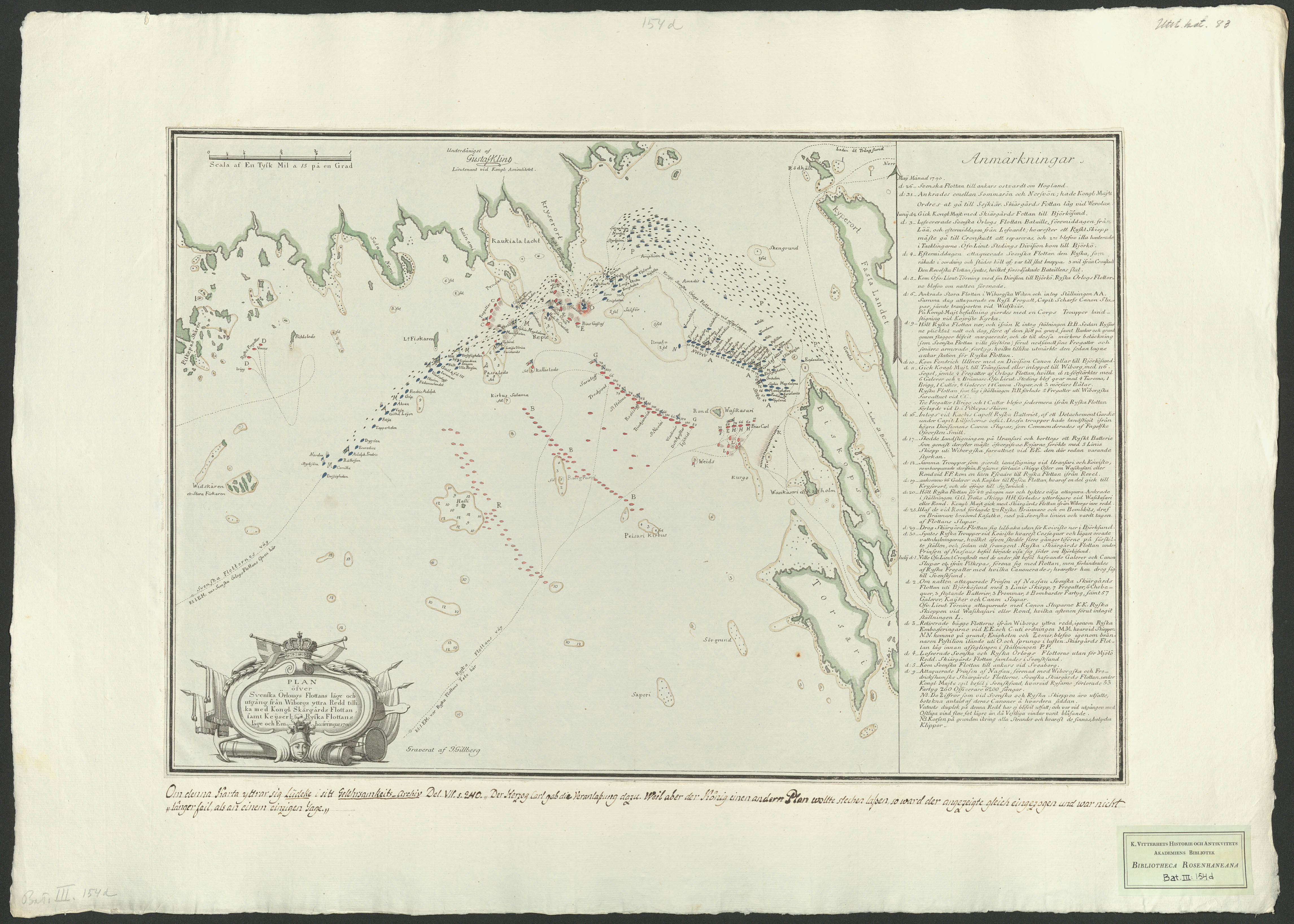 Beskrivning: 1 karta : Visar svenska och ryska flottornas positioner inför det andra slaget vid Svensksund 1790. Graverat af j. Gillberg ; Underdånigst af Gustaf Klint Lieutenant vid Kongl. Amiralitetet.