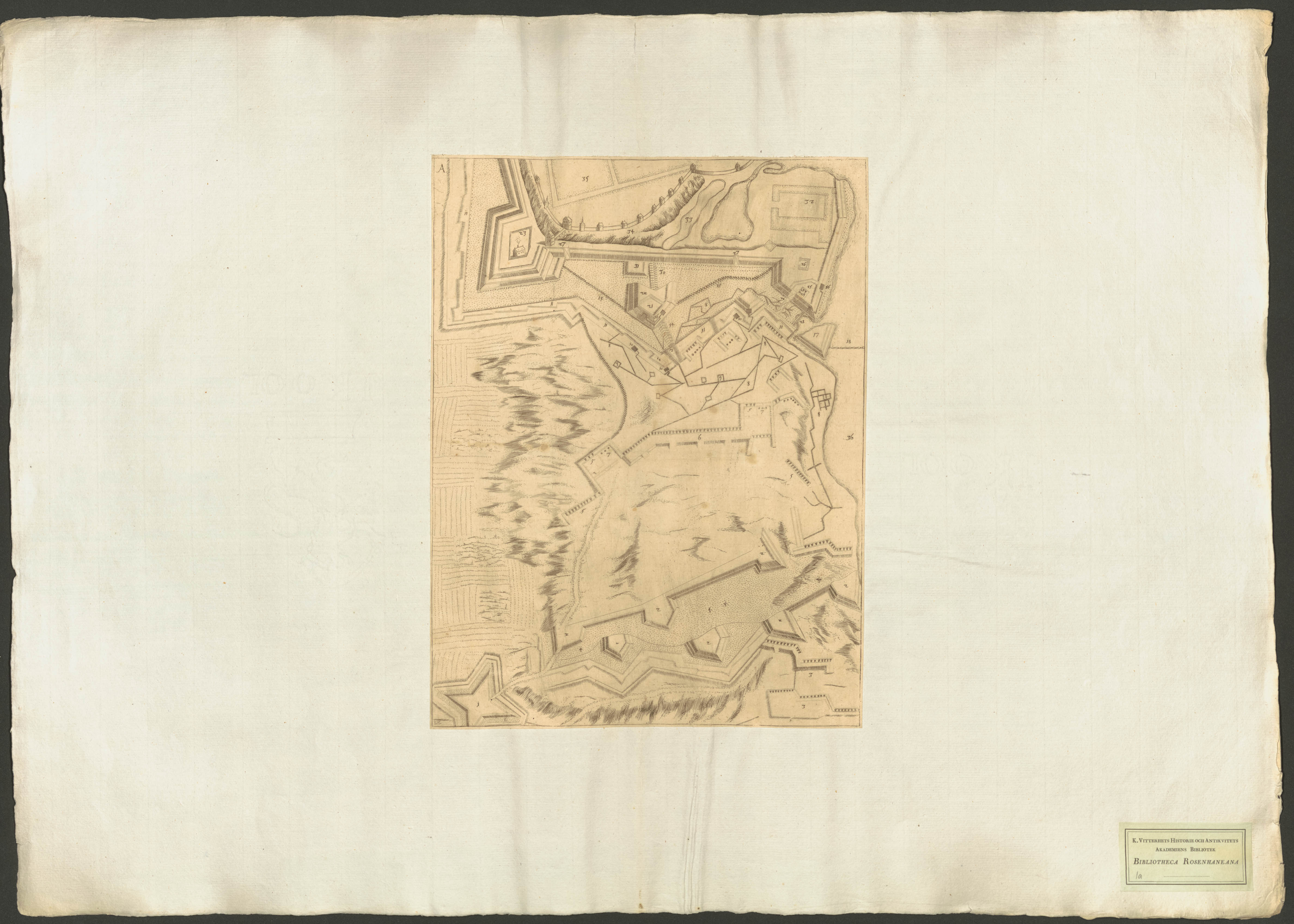 Beskrivning: 1 karta : Stjärnformad fästning. Kust eller strandlinje i bildens högerkant. De olika byggnadselementen är markerade med siffror. Teckenförklaring saknas.