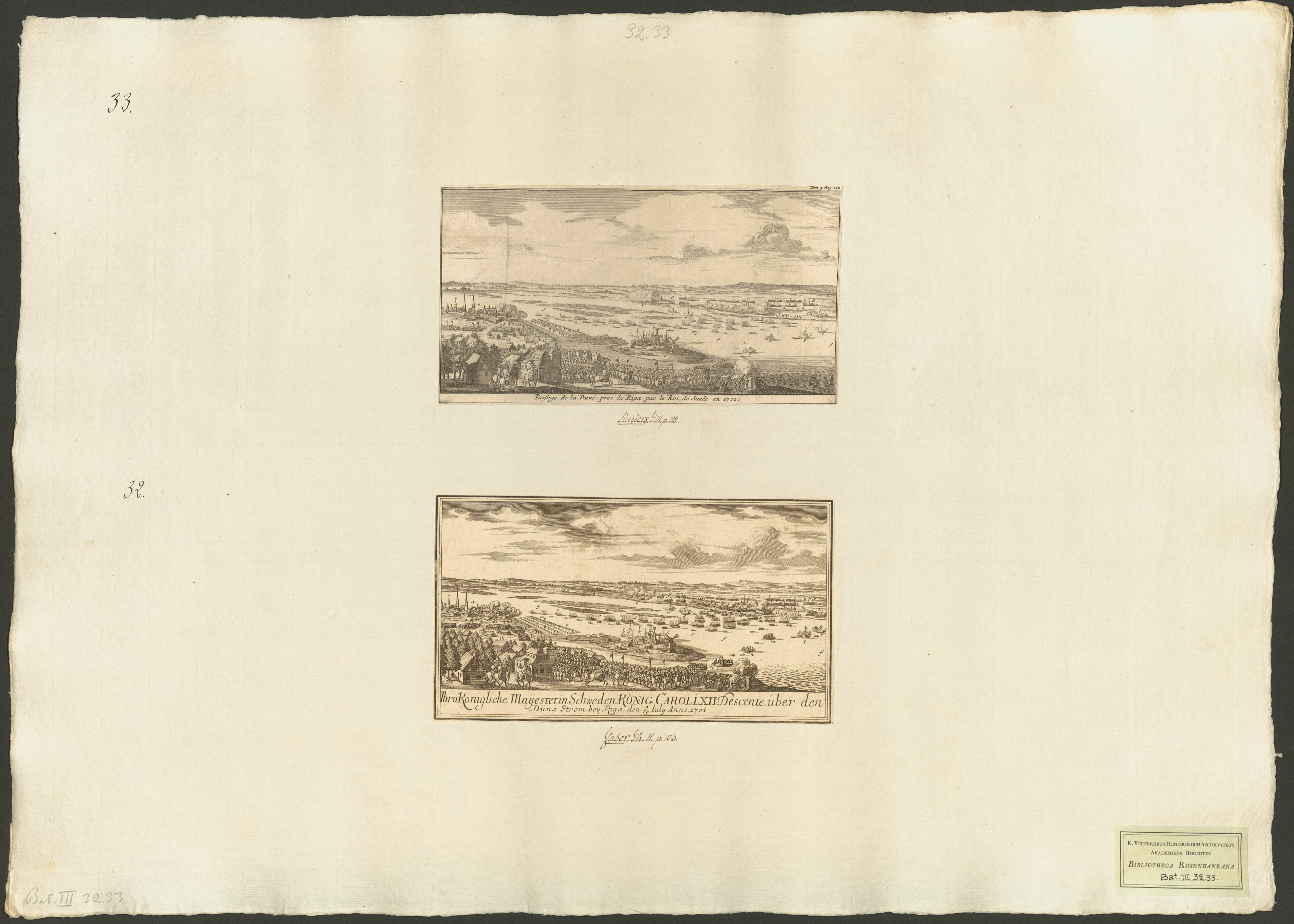 Ihro Königliche Maijestetin Schweden König Caroli XII descente über den Düna Strom bei Riga d 9/19 juli 1701.[Bild]