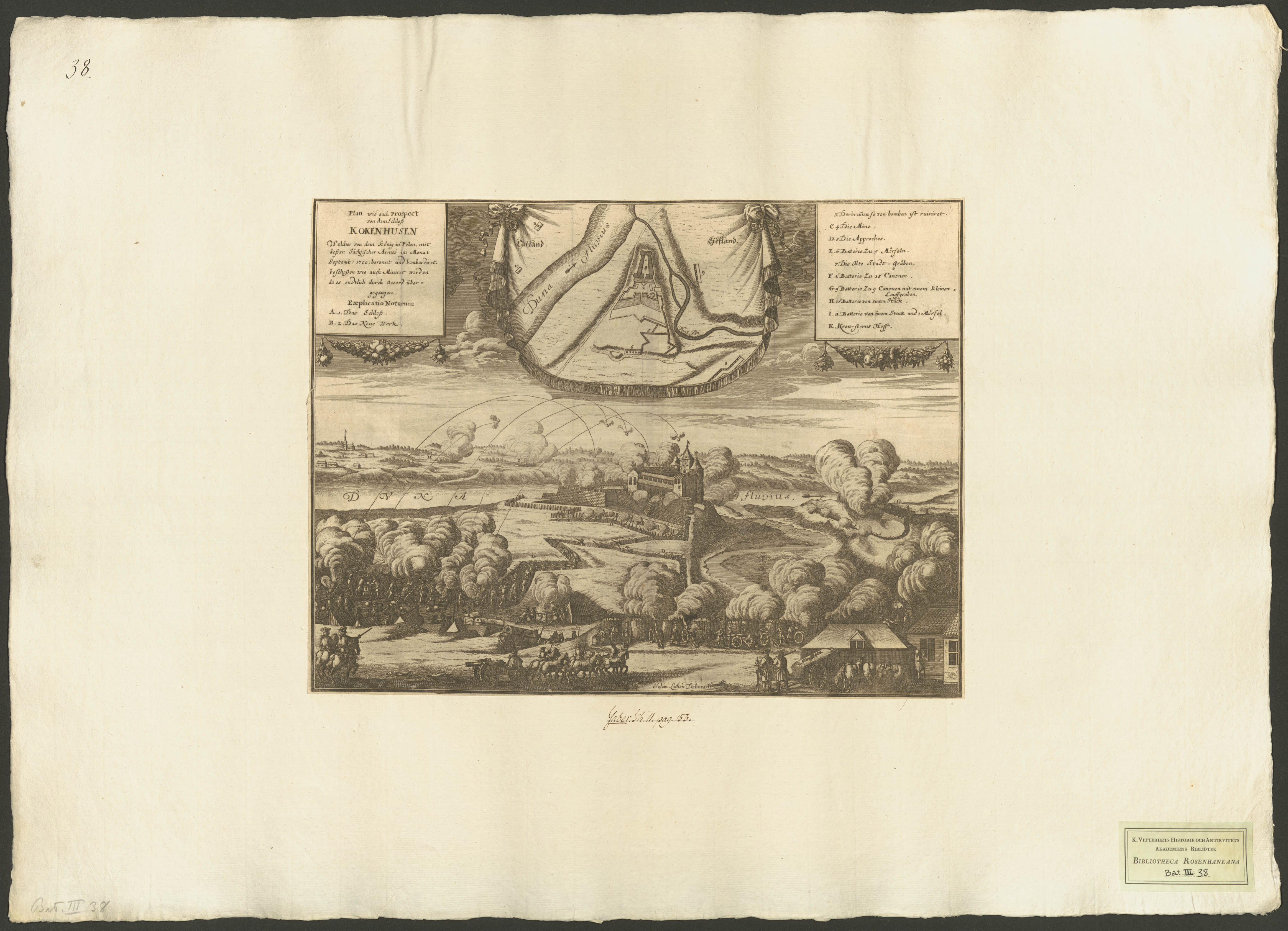 Beskrivning: 1 grafiskt bl. : Vy över anfallet mot slottet Kokenhusen. Överst i mitten en karta över fästningen på ett draperat tyg. Johan Lithén Delineavit
