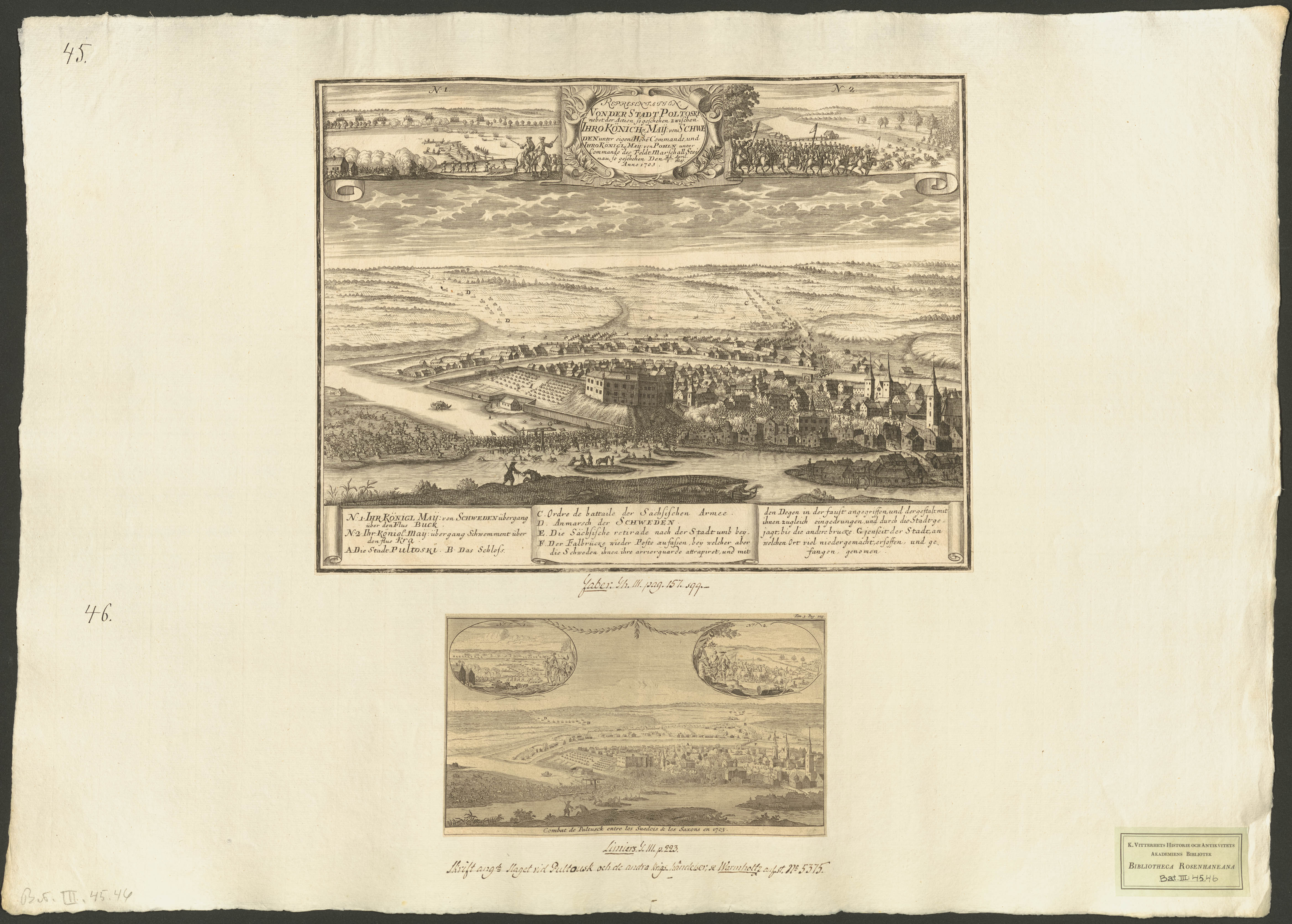 Beskrivning: 1 grafiskt bl. : Panorama över Pultusk efter slaget den 21 april 1703. Sachiska armén flyr över floden Narow.