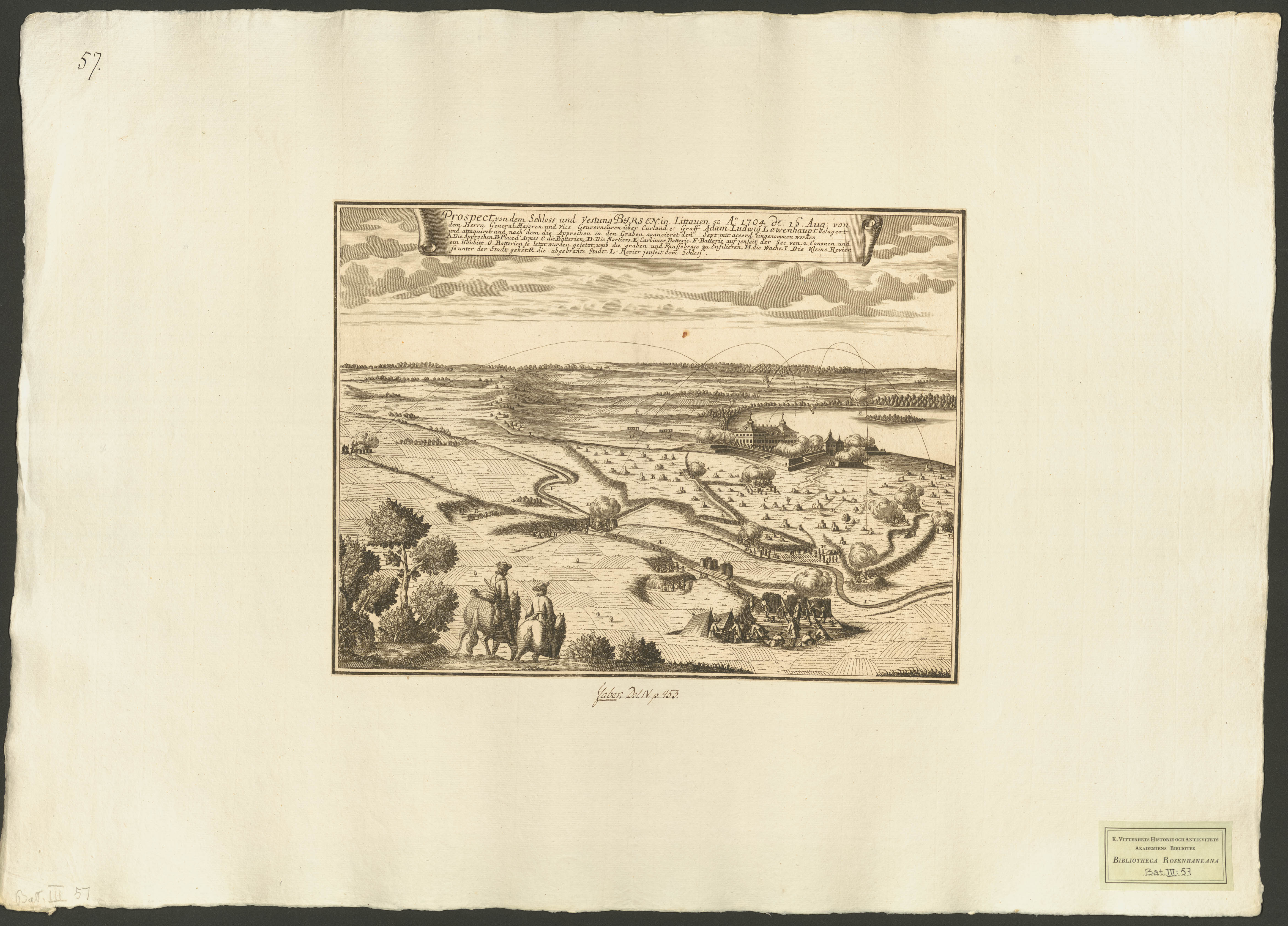 Beskrivning: 1 grafiskt bl. : Panorama över slottet Birsen som belägrades av svenska styrkor under greve Lewenhaupt 1704.