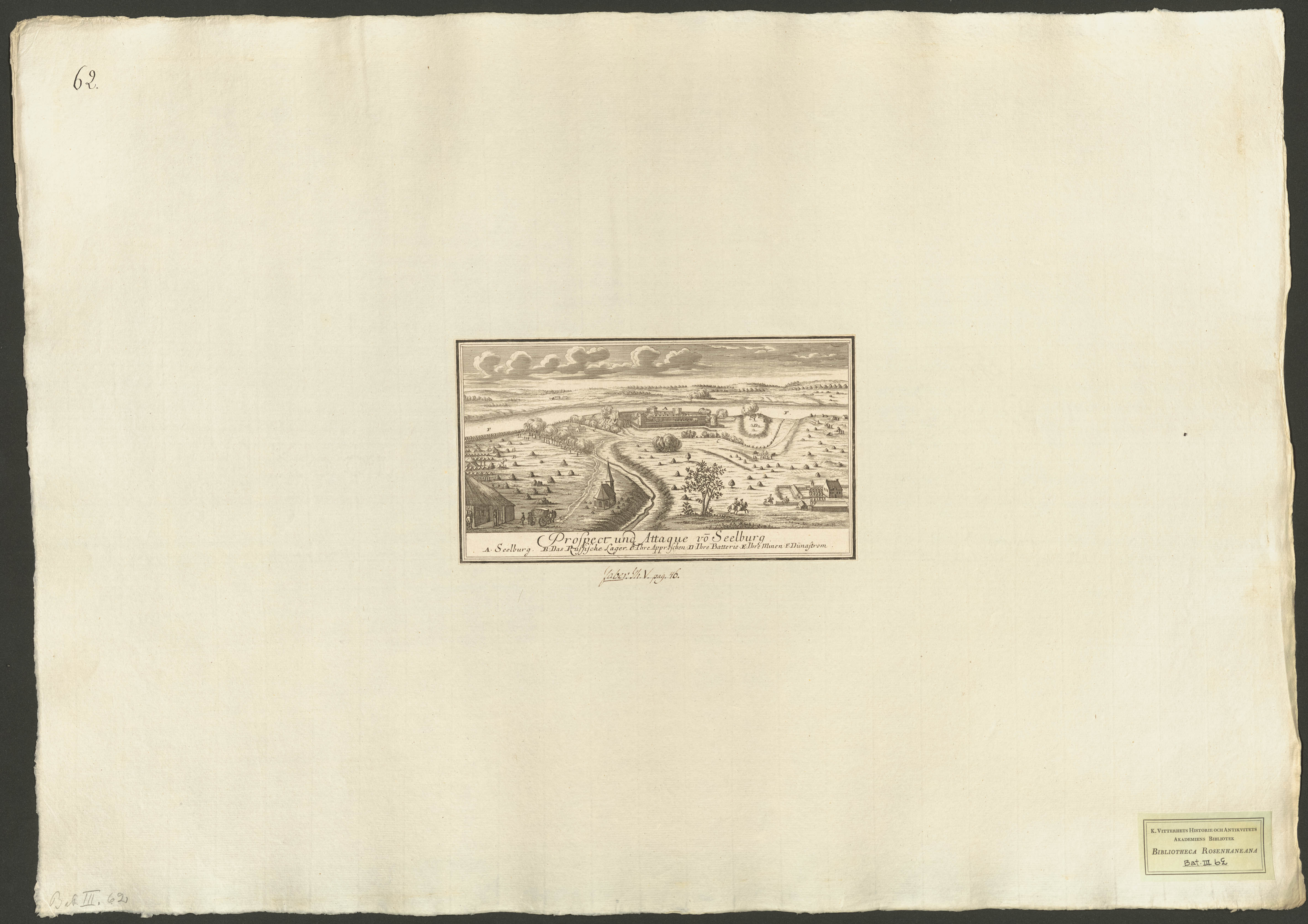 Beskrivning: 1 grafiskt bl. : Panorama över Seeburg med omnejd. Ryska trupper belägrar och beskjuter staden.