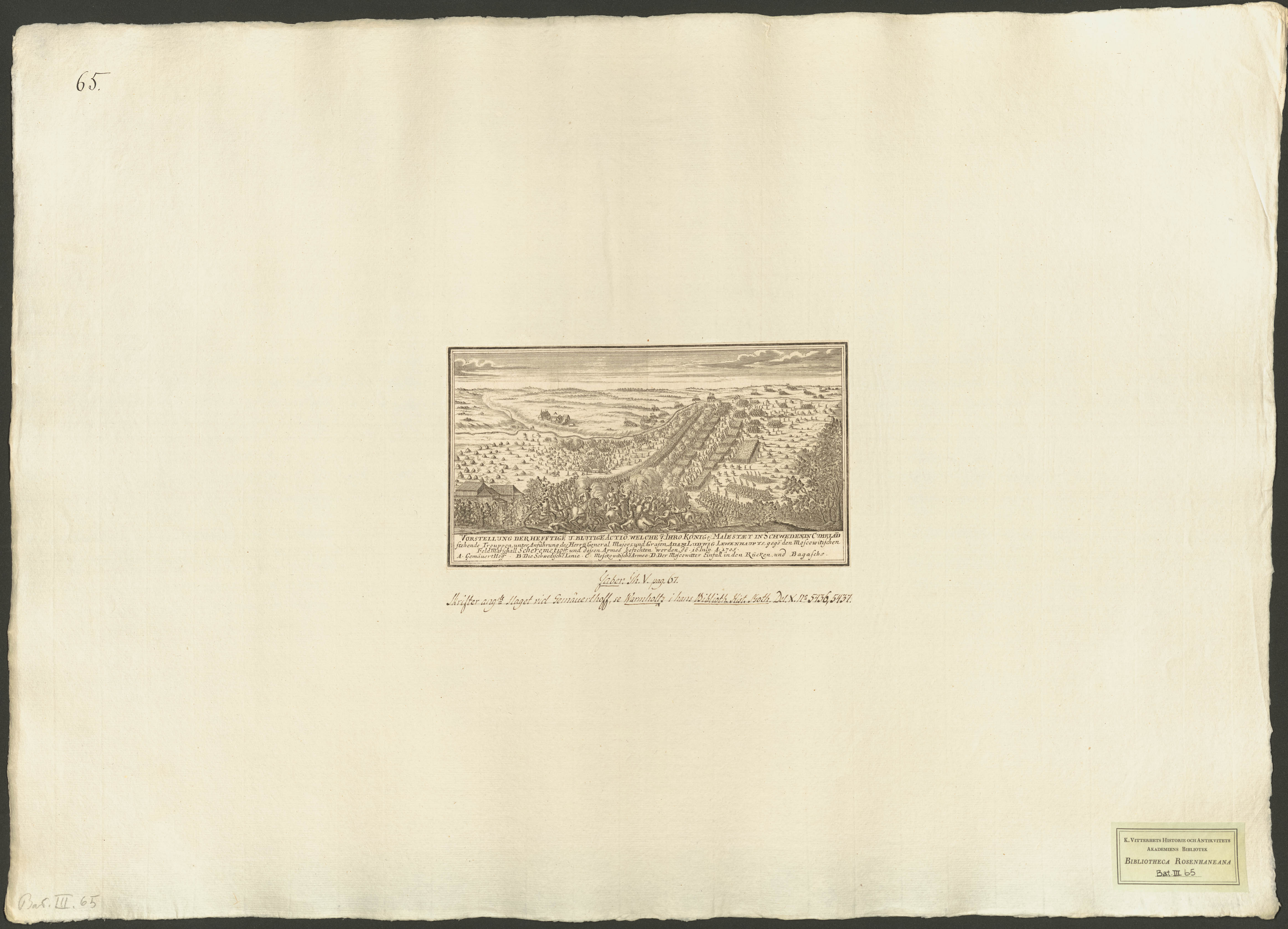 Beskrivning: 1 grafiskt bl. : Panorama över slagfältet vid Gemauerthof den 16 juli 1705.
