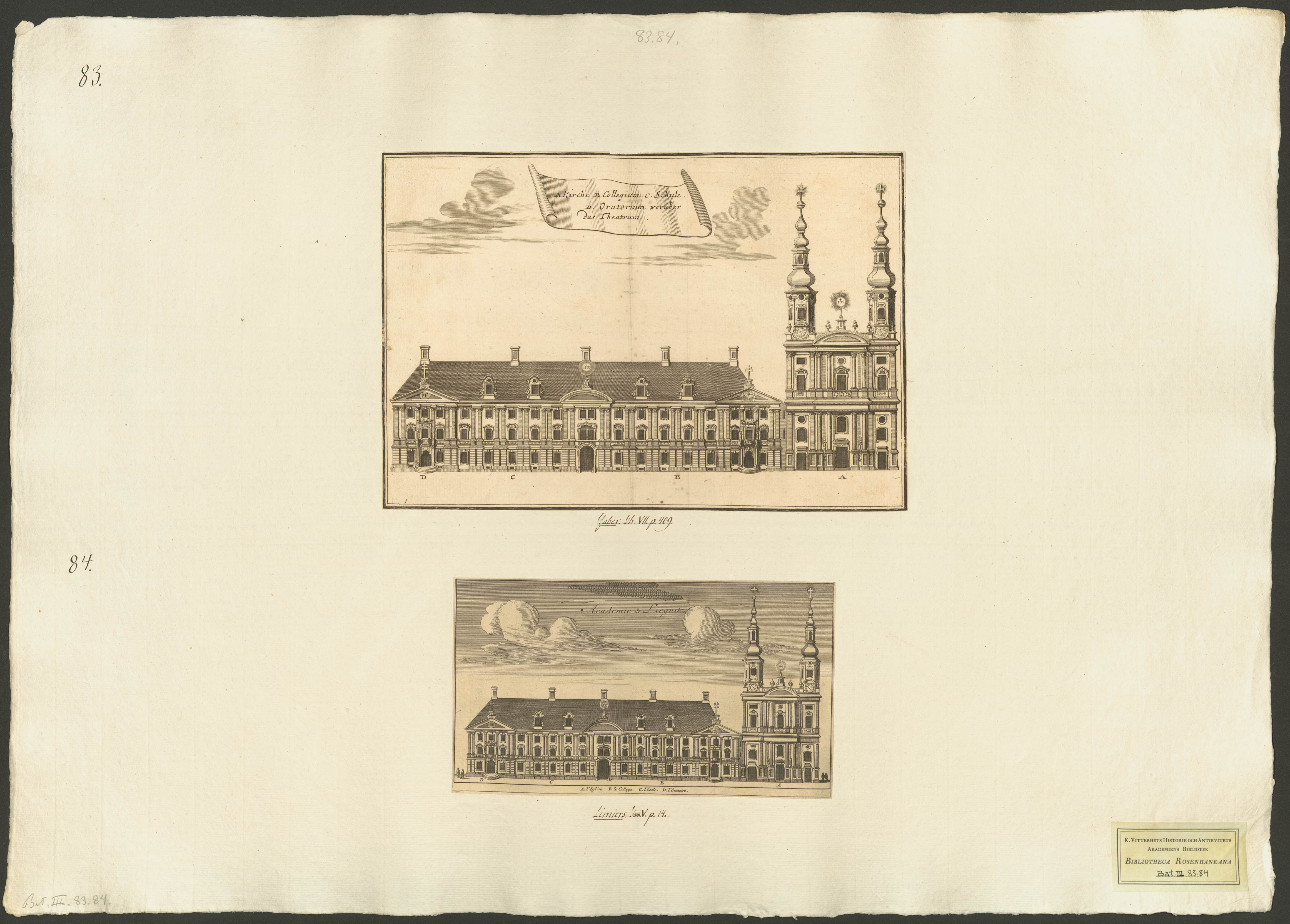 Beskrivning: 1 grafiskt bl. : Jesuitkyrkan och -collegiet i Legnica. Arkitektritning av fasaderna.