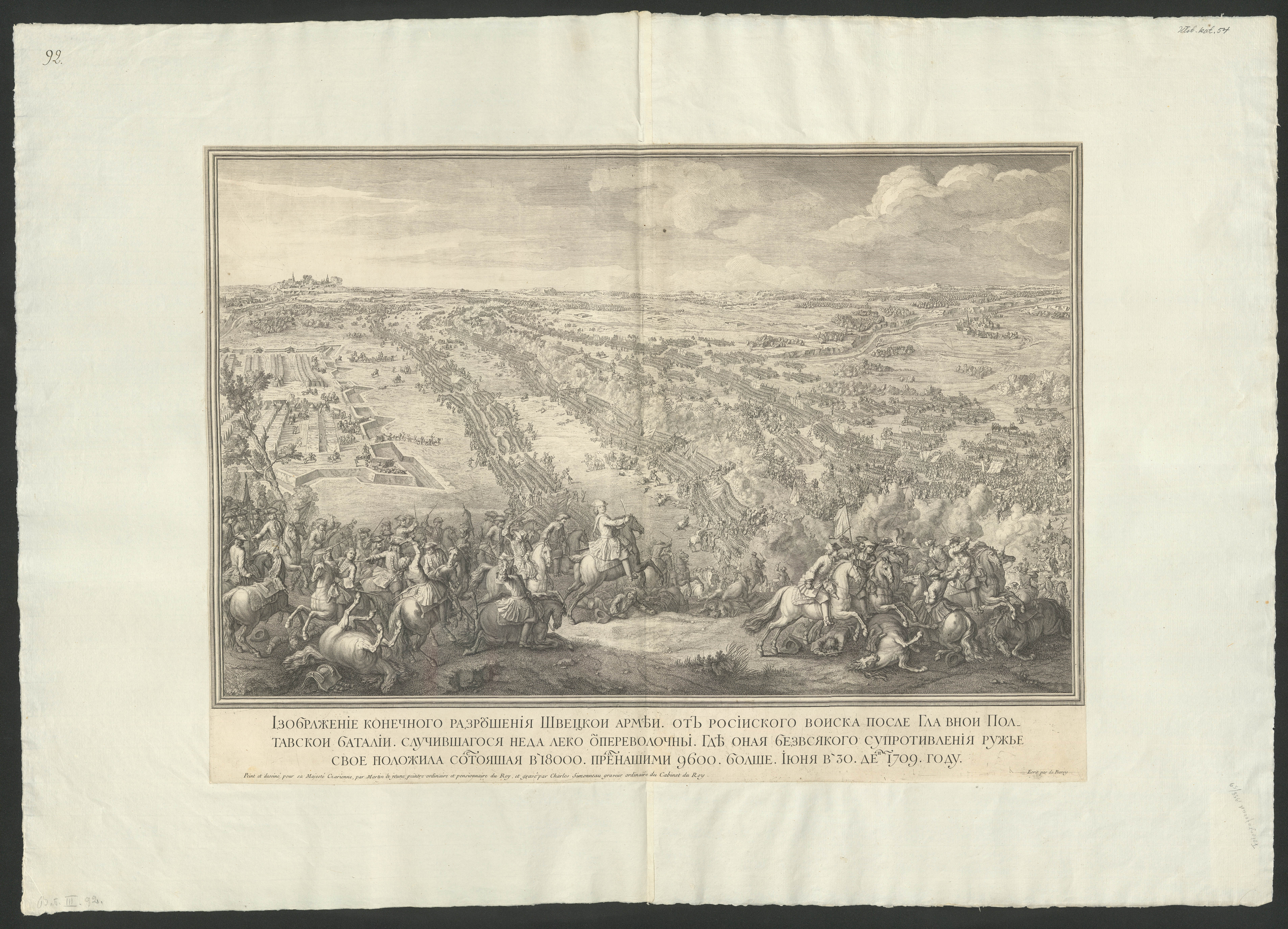Beskrivning: 1 grafiskt bl. : Panorama över slaget vid Poltawa den 27 juni 1709. I förgrunden närstrider. Peint et dessiné pour ... Martin le jeune ... et gravé par Charles Simonneau