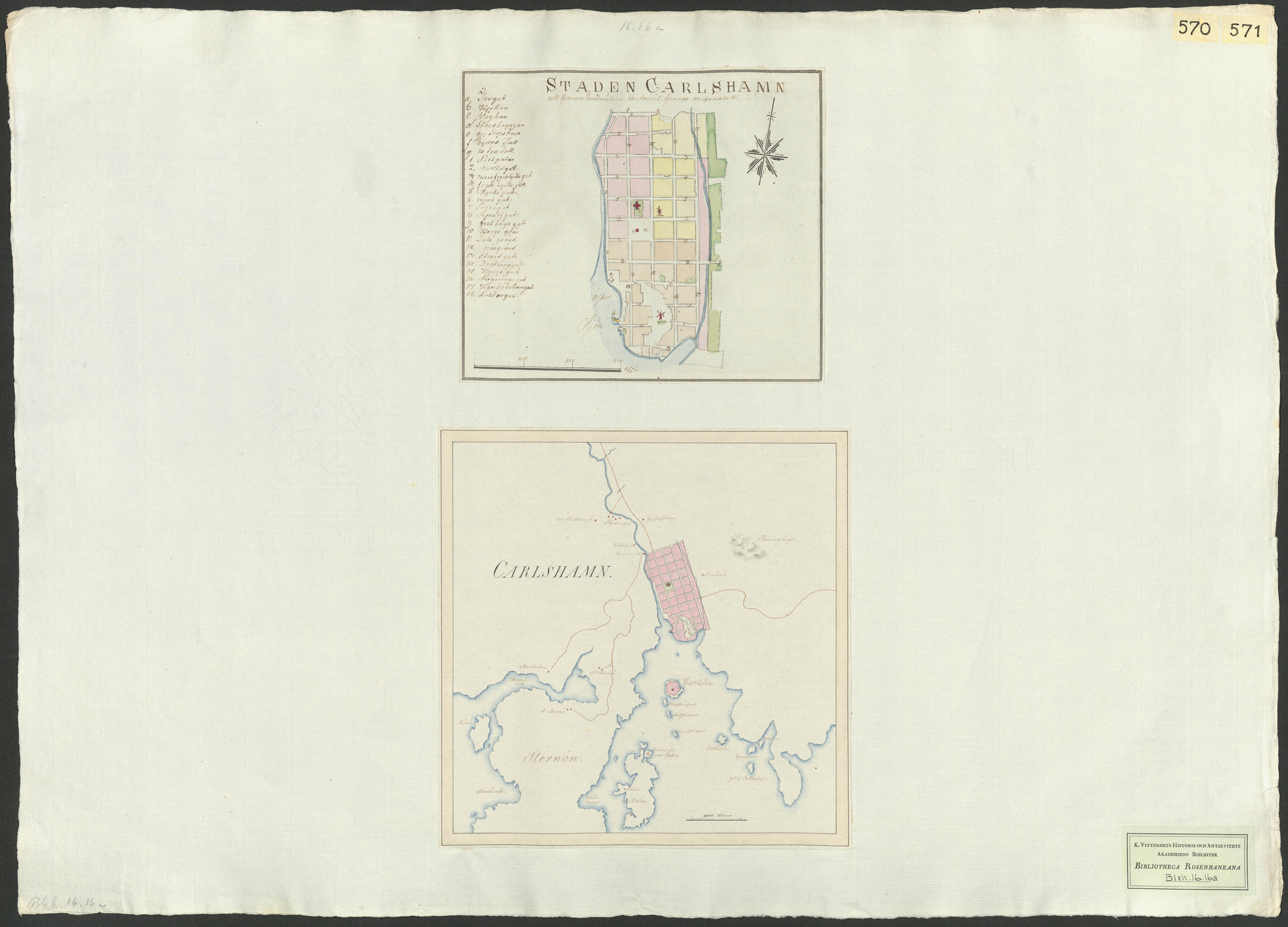 Beskrivning: 1 handritad karta : Visar stadskvarteren. Teckenförklaring. Nordpil.