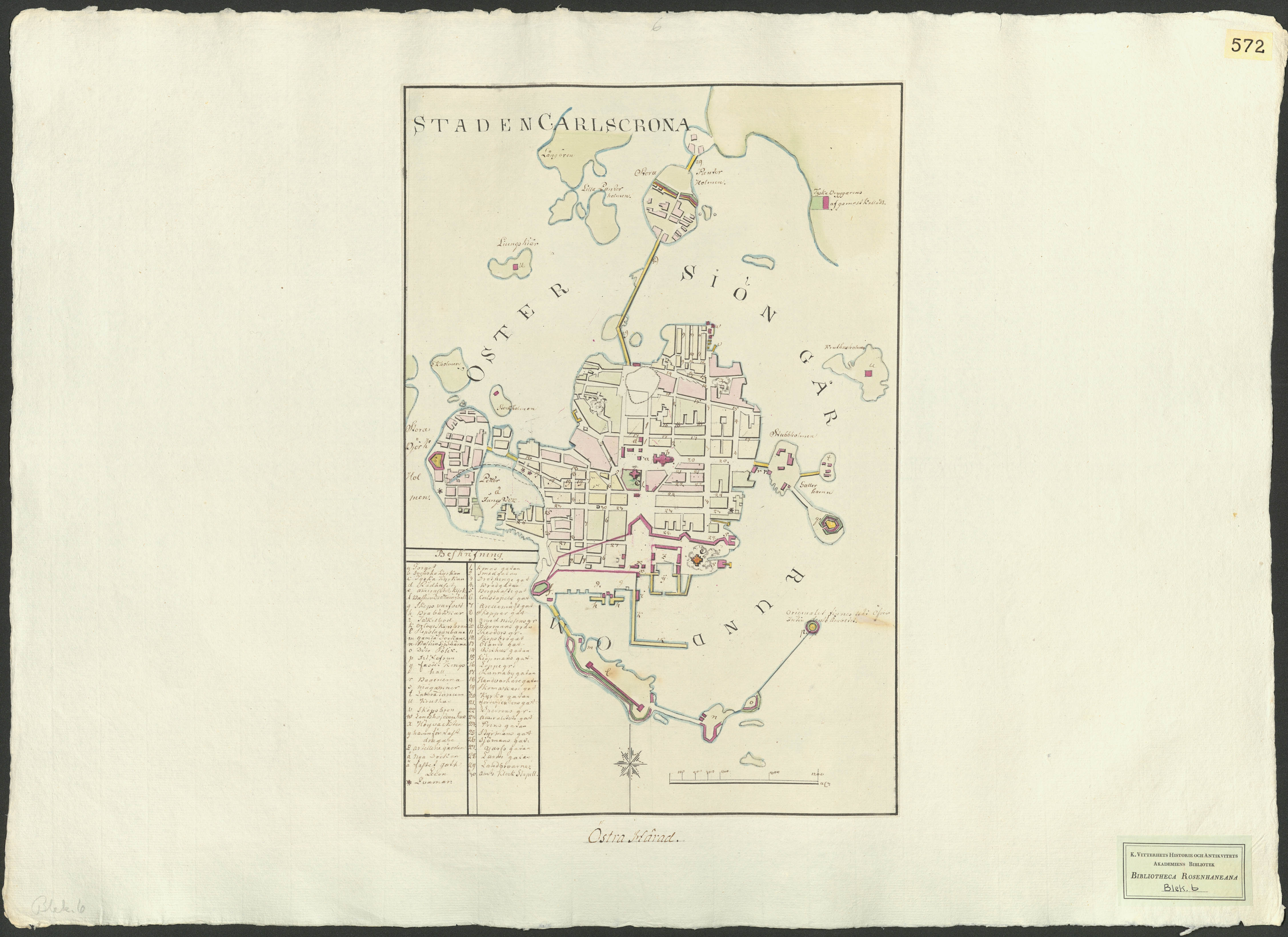 Beskrivning: 1 handritad karta : Detaljerad karta över stadskvarteren och staden tillhöriga holmar och befästningar.