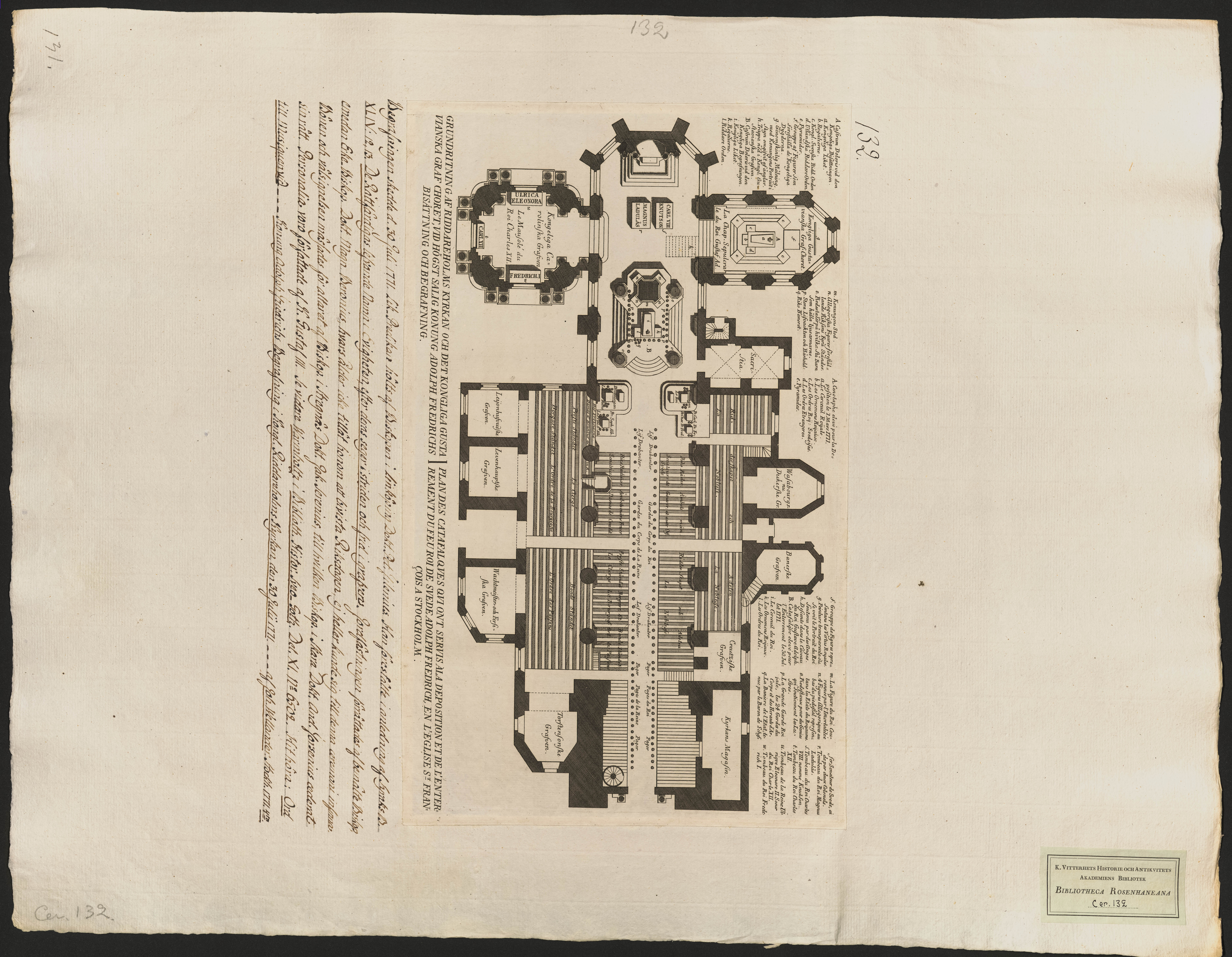 Grundritning af Riddareholmskyrkan och det kongliga Gustavianska Graf choret, vid högst salig Konung Adolph Fredrichs bisättning och begrafning..[Bild]