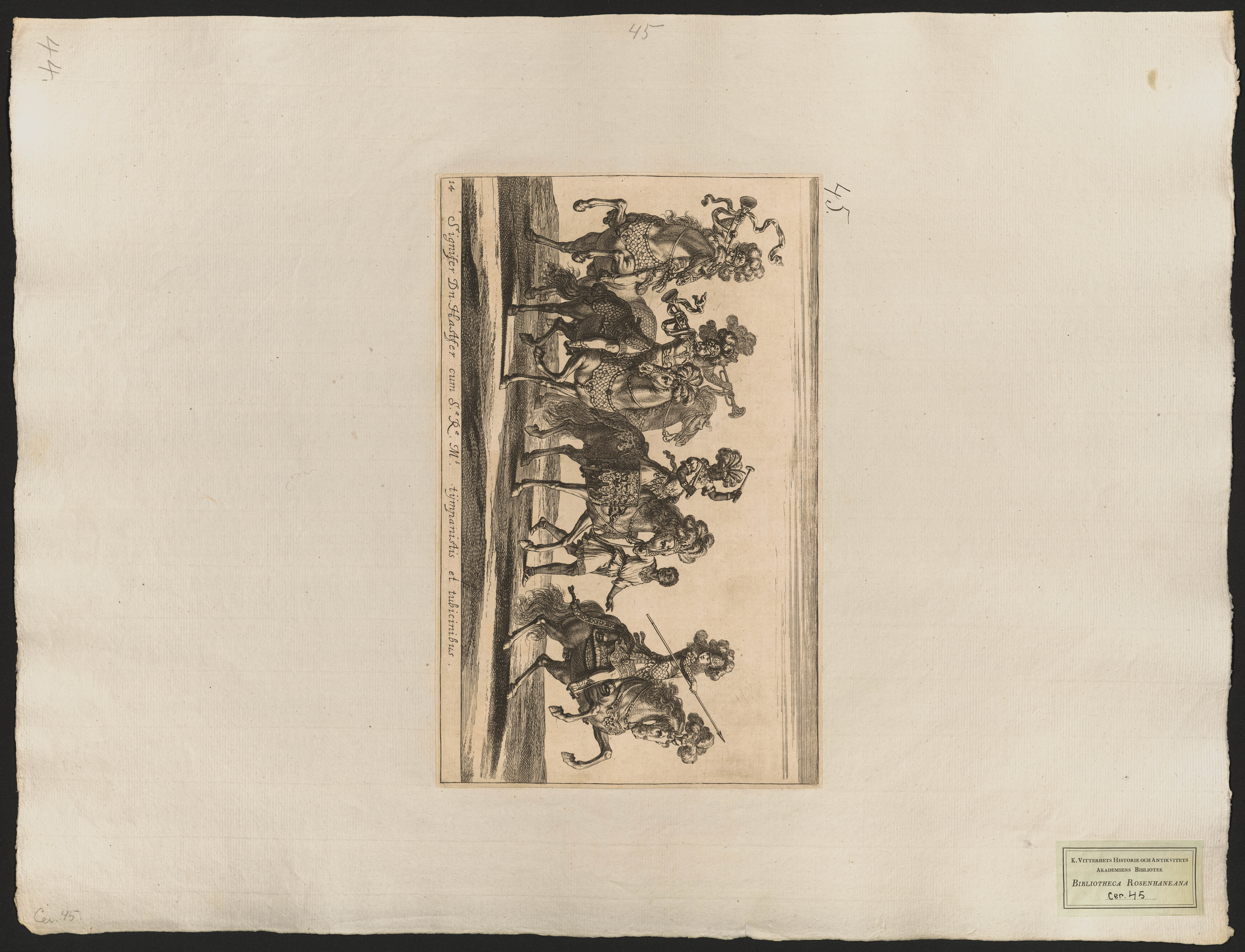 Beskrivning: 1 grafiskt bl. : En förridare, en morian som pukslagare, med lärdräng som leder hästen. Därefter två trumpetare till häst.