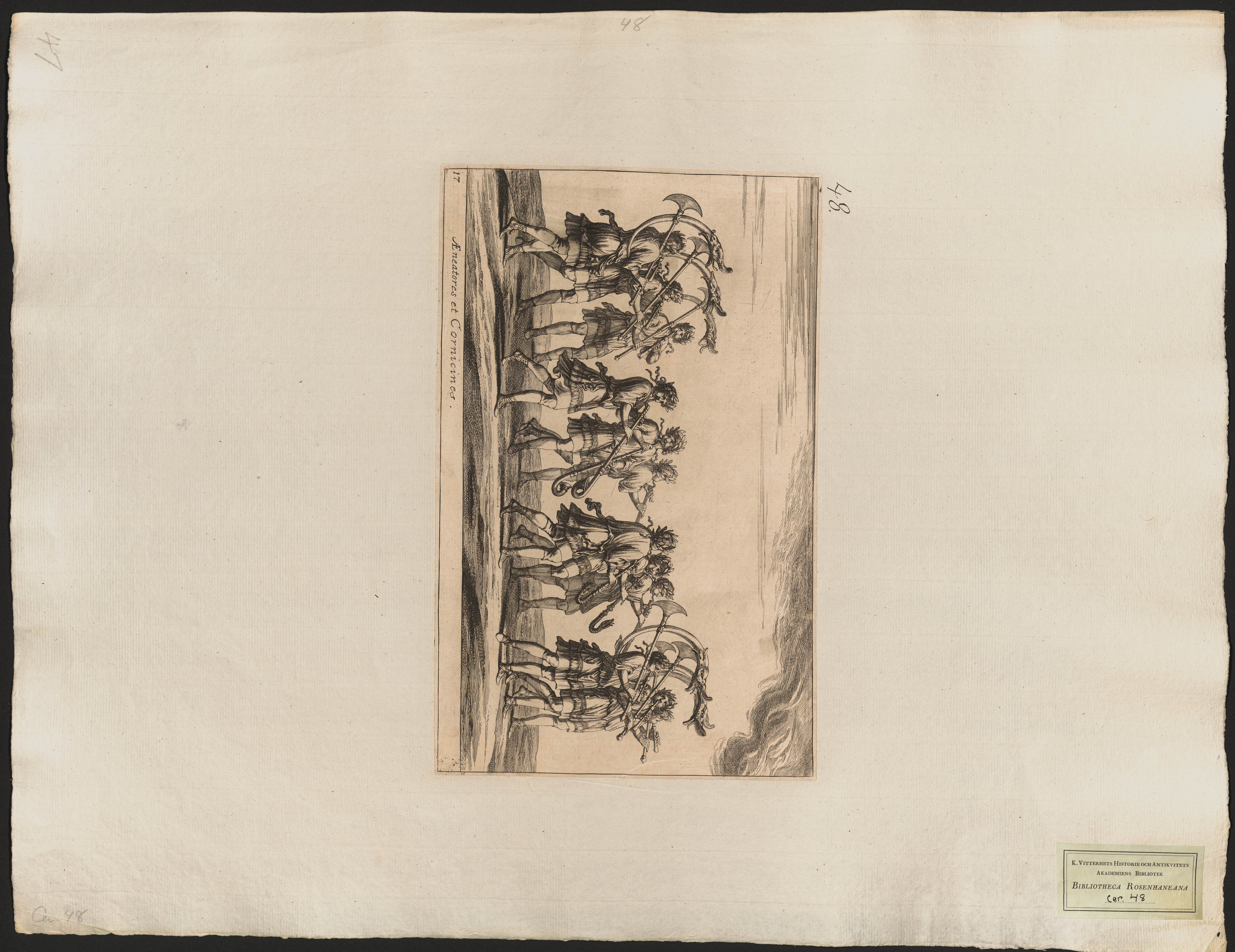 Beskrivning: 1 grafiskt bl. : Tolv horn- och basunblåsare i romerska dräkter.