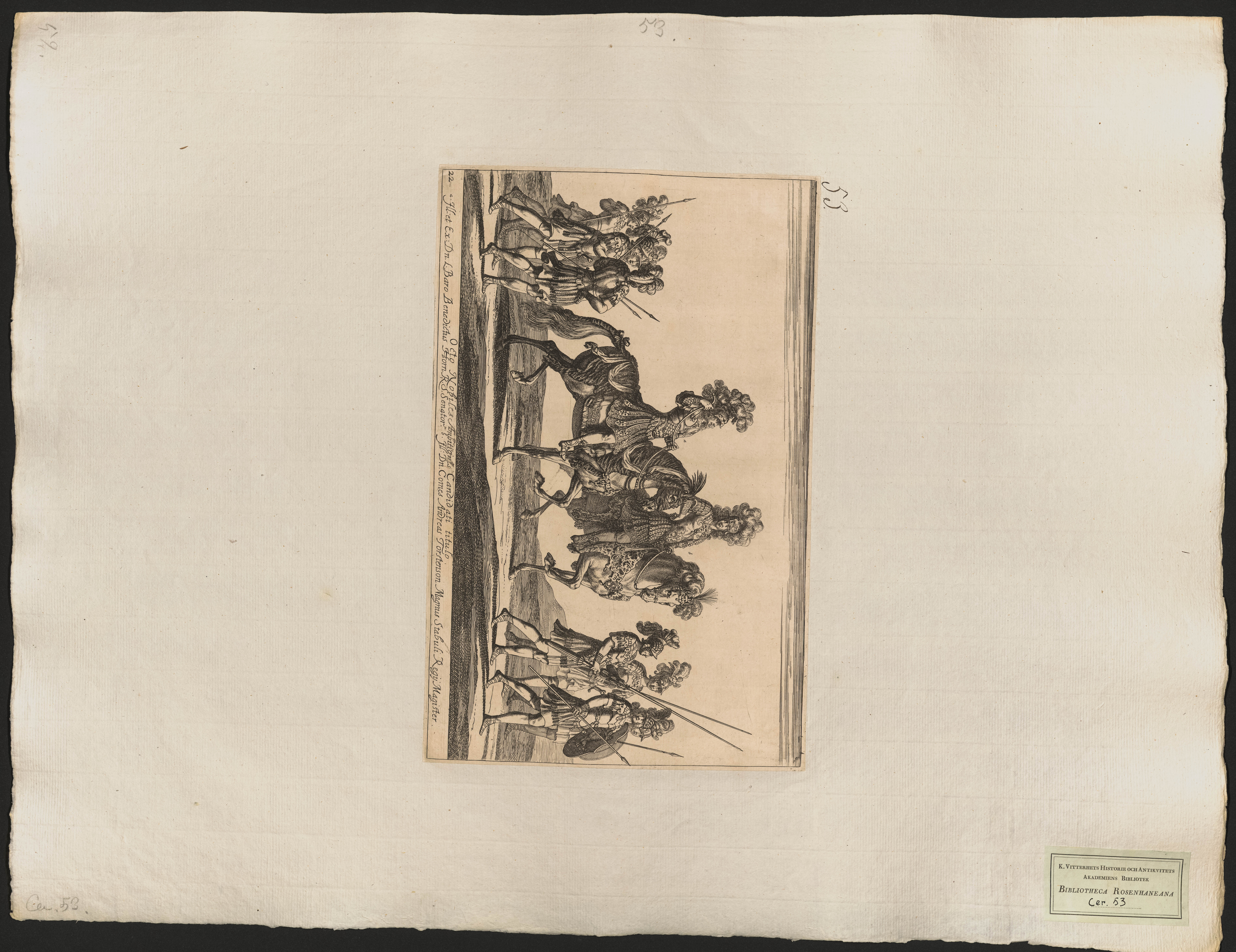 Beskrivning: 1 grafiskt bl. : Bengt Horn och Anders Torstenson som romerska senatorer till häst, omgivna av romerska krigare med lansar.