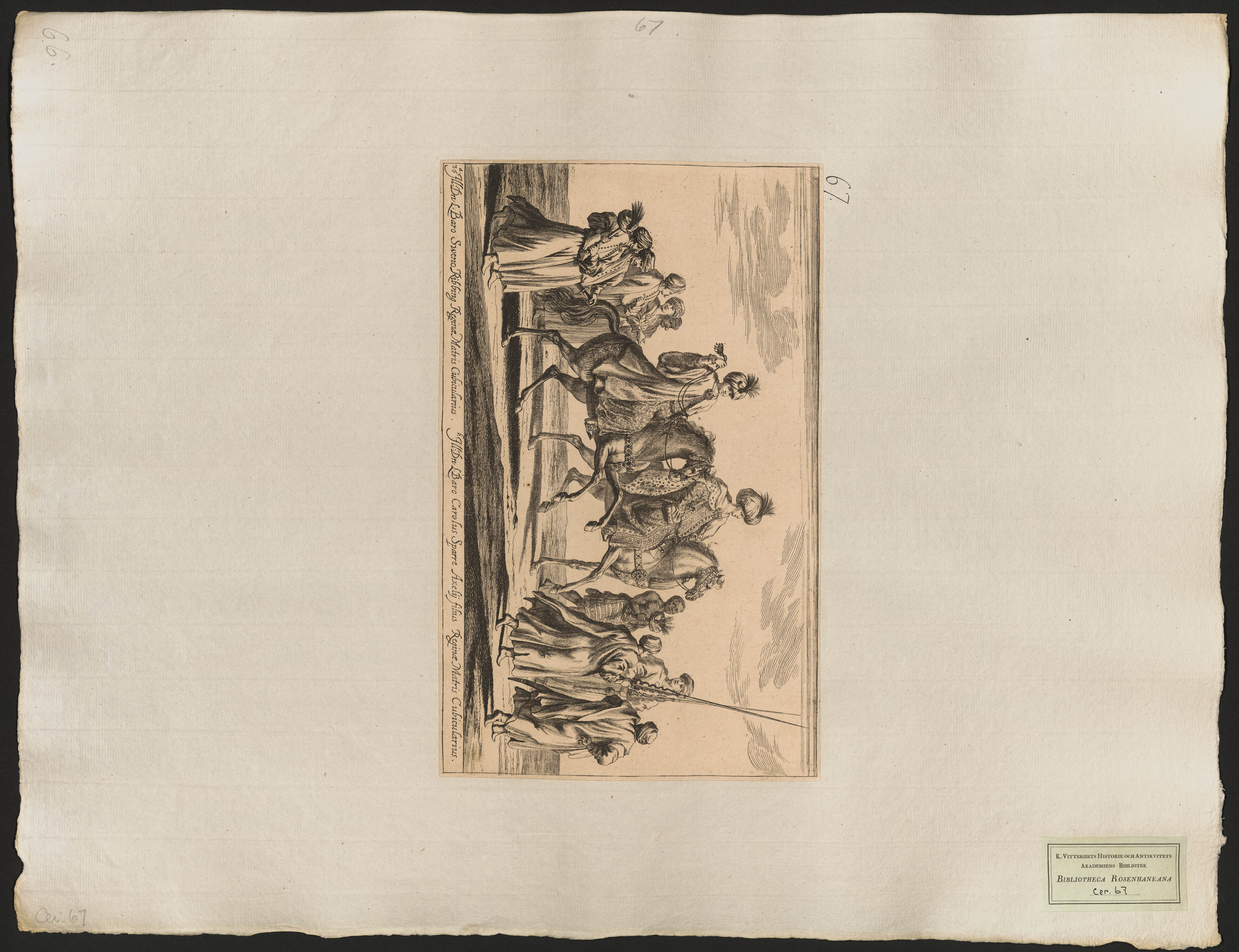 Beskrivning: 1 grafiskt bl. : Sven Ribbing och Carl Axelsson Sparre till häst, som furstar, iförda kaftaner och turbaner, omgivna av turkiskt fotfolk samt en morian