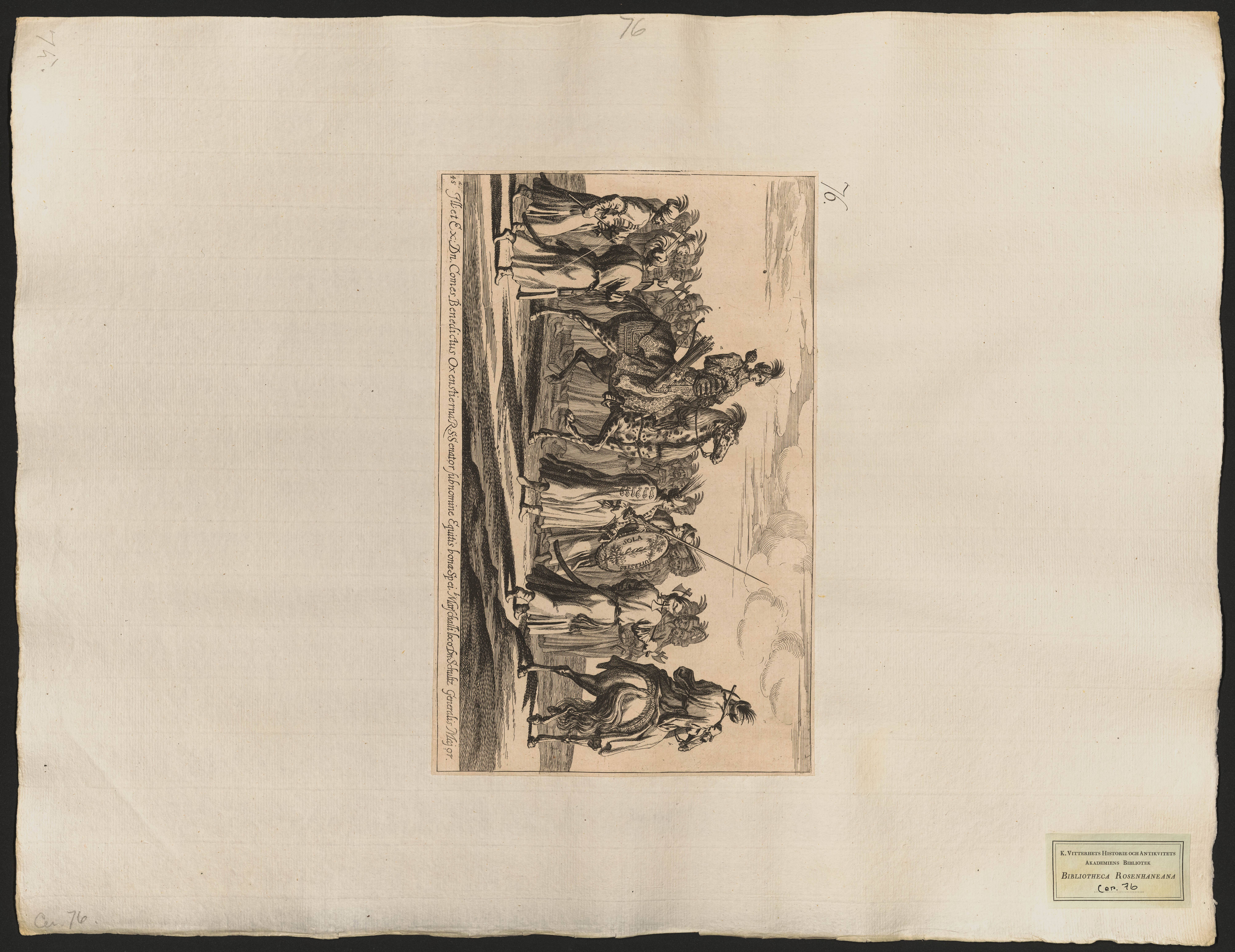 Beskrivning: 1 grafiskt bl. : Bengt Oxenstierna häst, omgiven av fotfolk. Gruppen ledd av generalmajor Schultz till häst. Alla i rysk mundering.