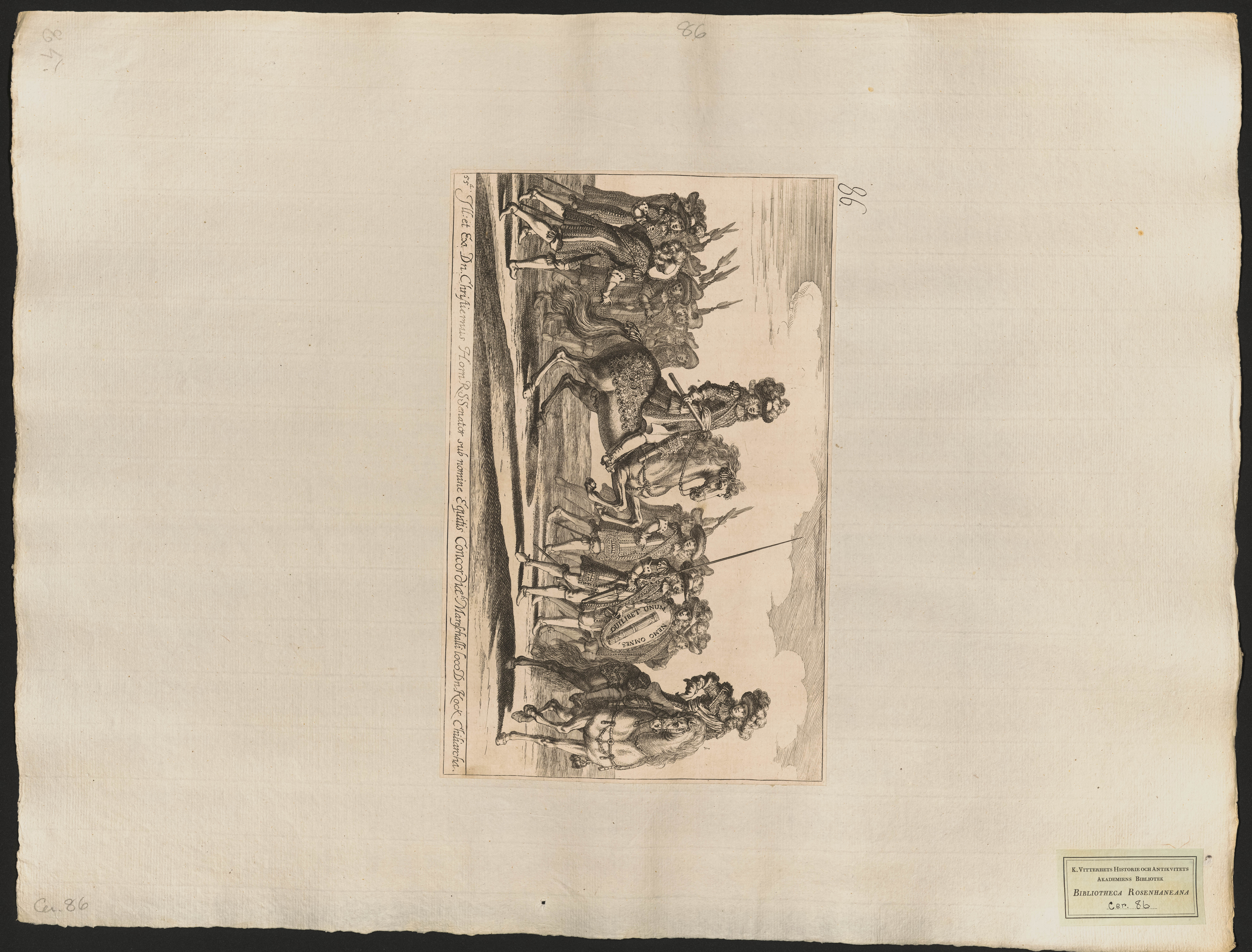 Beskrivning: 1 grafiskt bl. : Krister Horn till häst, omgiven av fotfolk och med Kock som förridare. Alla föreställande europeer.