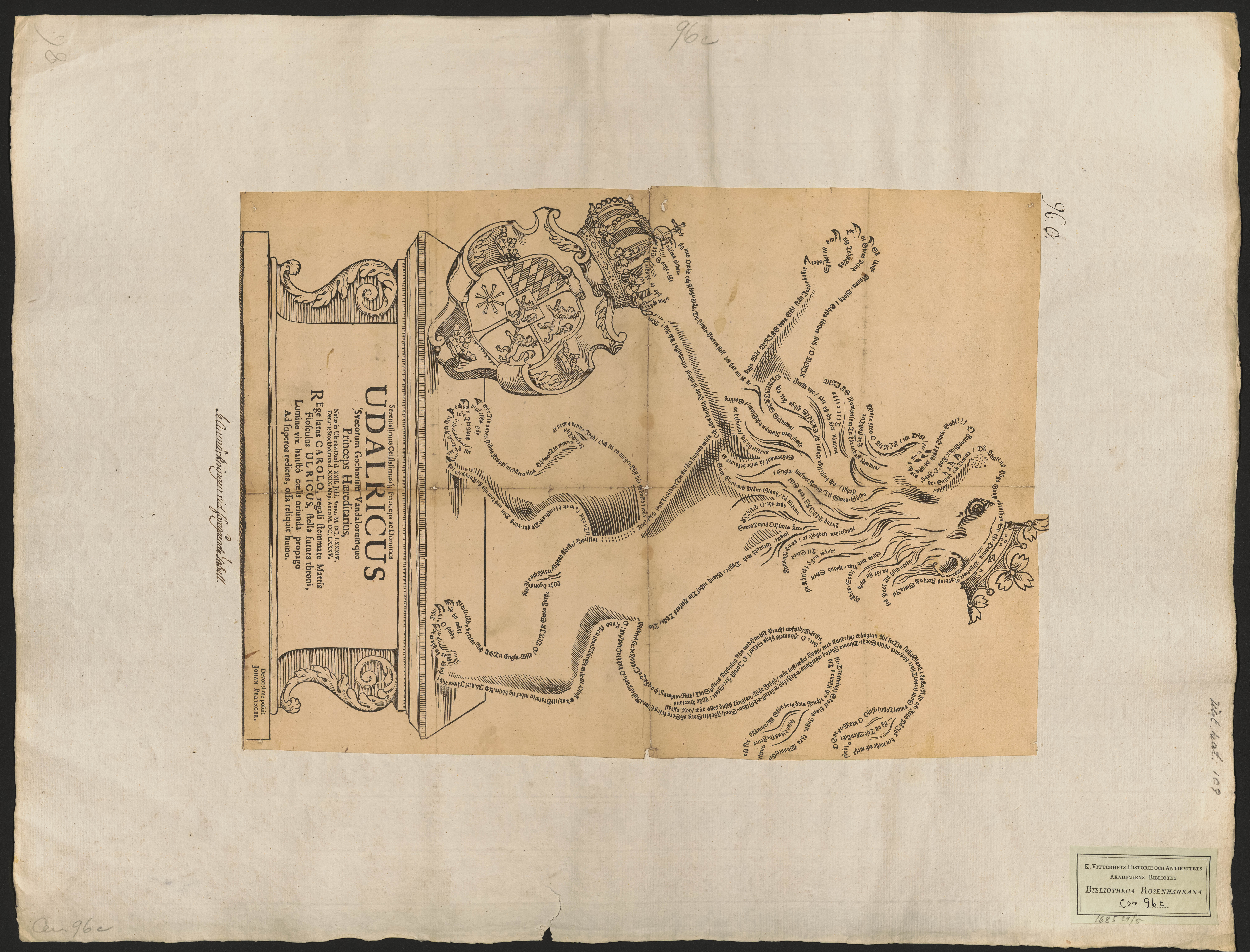 Beskrivning: 1 grafiskt bl. : Sorgekväde över prins Ulrik, död vid 1 års ålder den 29 maj 1685. Verser ställda i form av ett krönt lejon med kluven svans. devotissime posuit Johan Peringer.