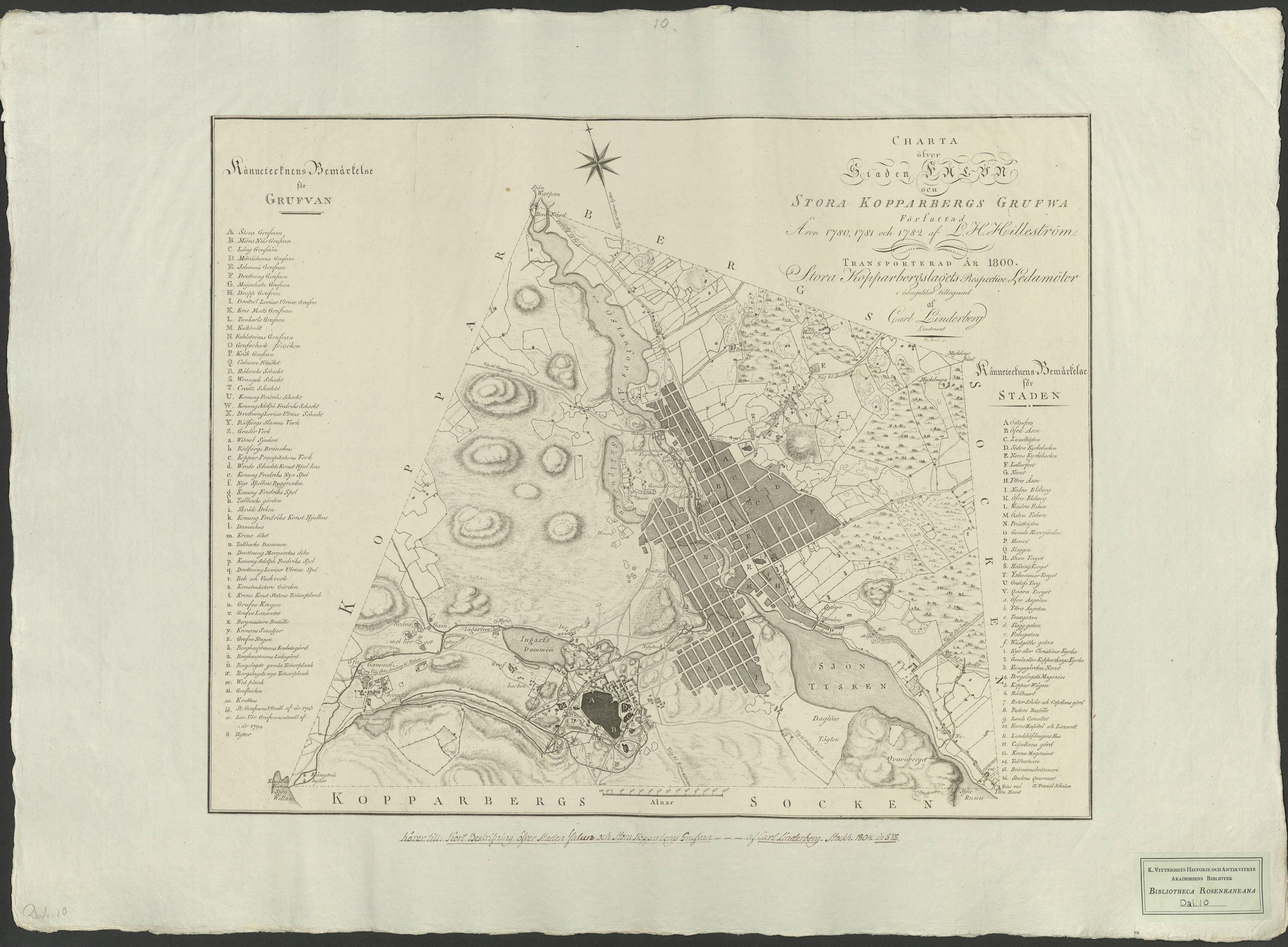Beskrivning: 1 karta : Mycket välgjord topografisk karta över staden och gruvan med teckenförklaringar för vardera. Nordpil. författad åren 1780, 1781 och 1782 af L. H. Hilleström. Transporterad år 1800 ... af Carl Linderberg. Fr. Akrel Sc.