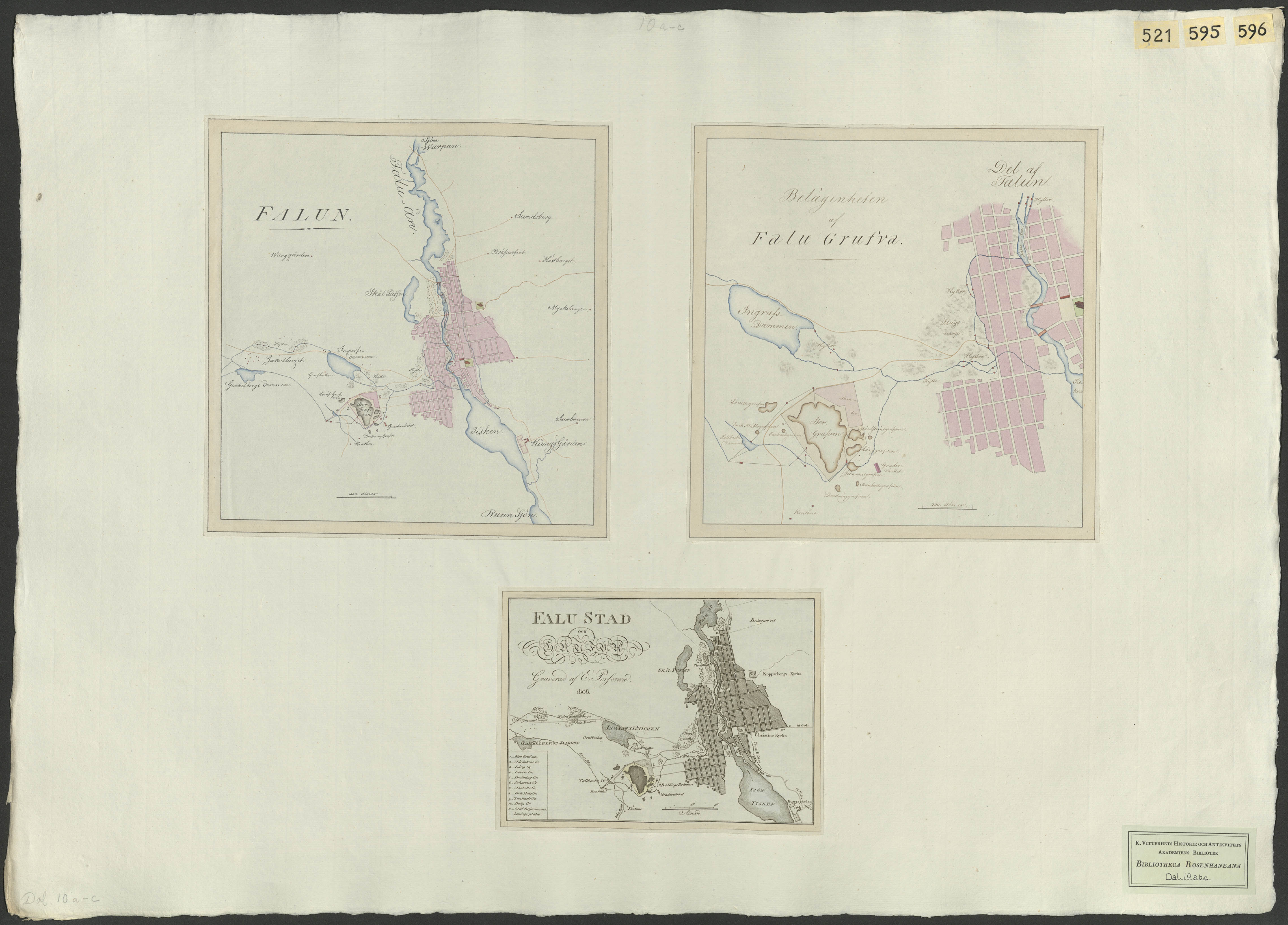 Beskrivning: 1 handritad karta : Visar stadskvarteren, gruvan samt närmaste omgivningar.