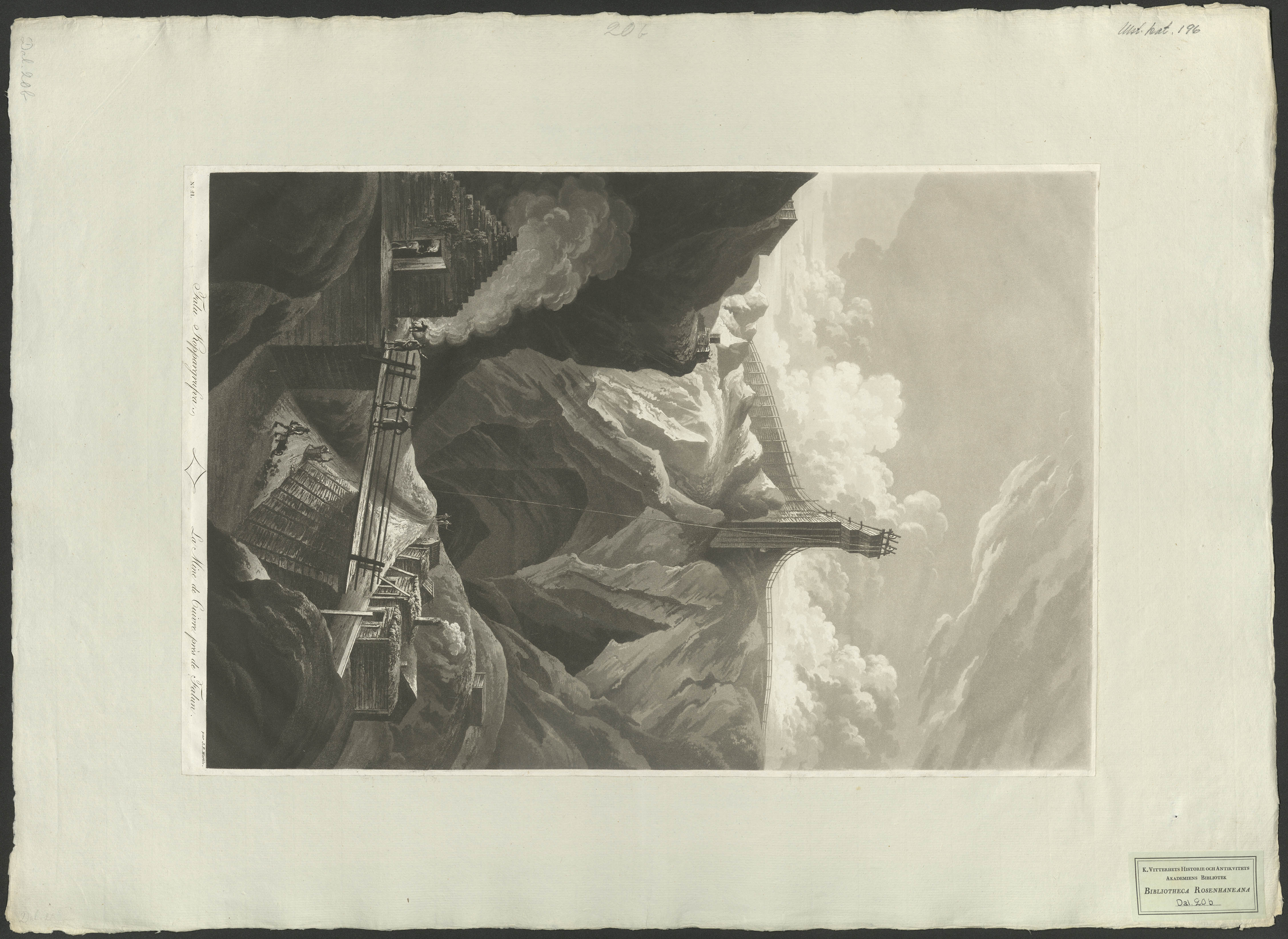 Beskrivning: 1 grafiskt bl. : Utsikt mot en del av gruvanläggningen. Ett schakt med en hissanordning. par J. F. Martin