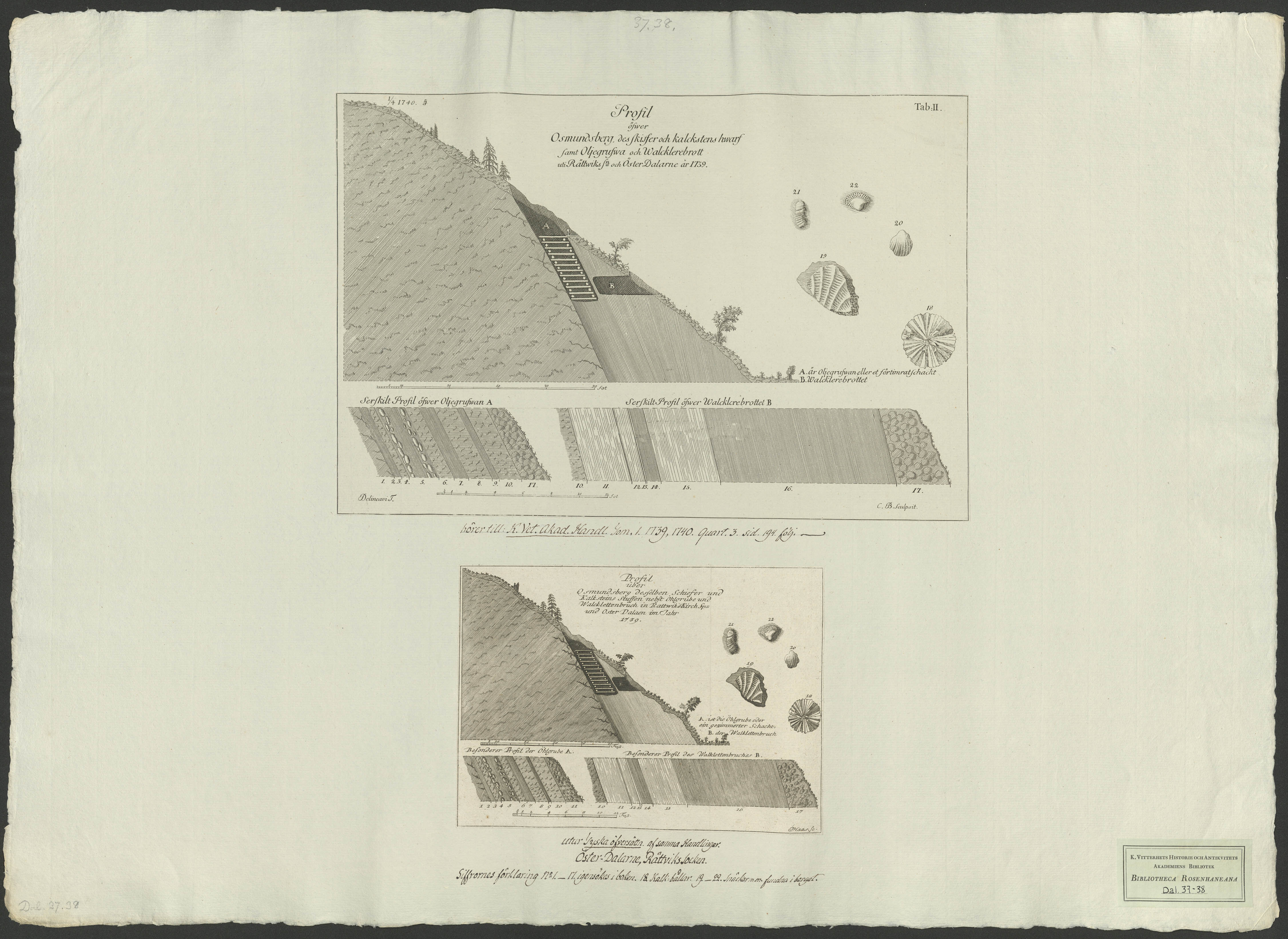 Profil öfver Osmundsberg, dess skiffer och kalckstens hwarf samt oljegrufwa och walcklerebrott uti Rättwiks sn och Öster Dalarne år 1739.[Bild]