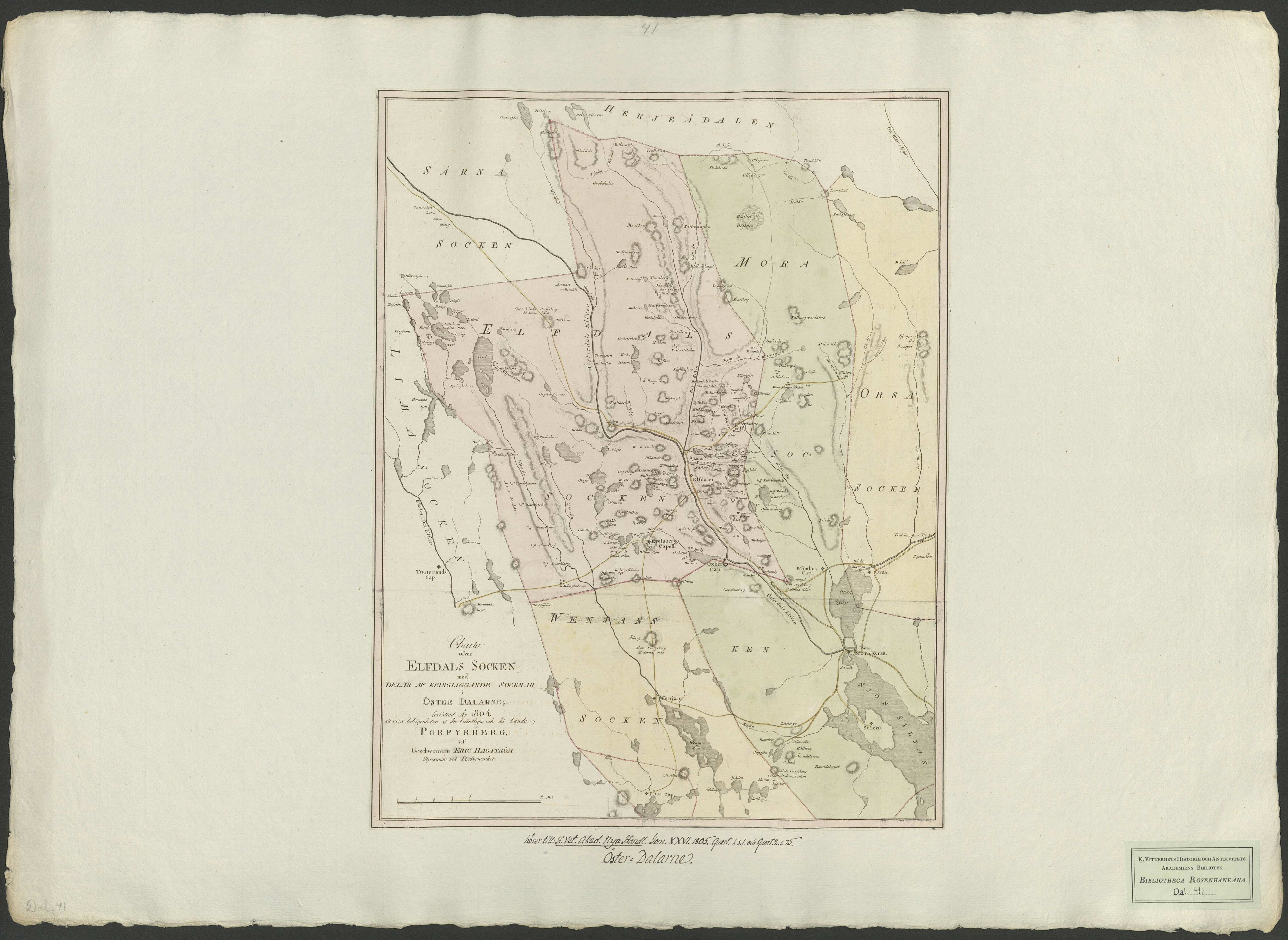 Charta öfver Elfdals socken med delar af kringliggande socknar i Öster Dalarne, författad år 1804, att visa belägenheten af der befintliga och då kända porfyrberg,.[Kartografiskt material]