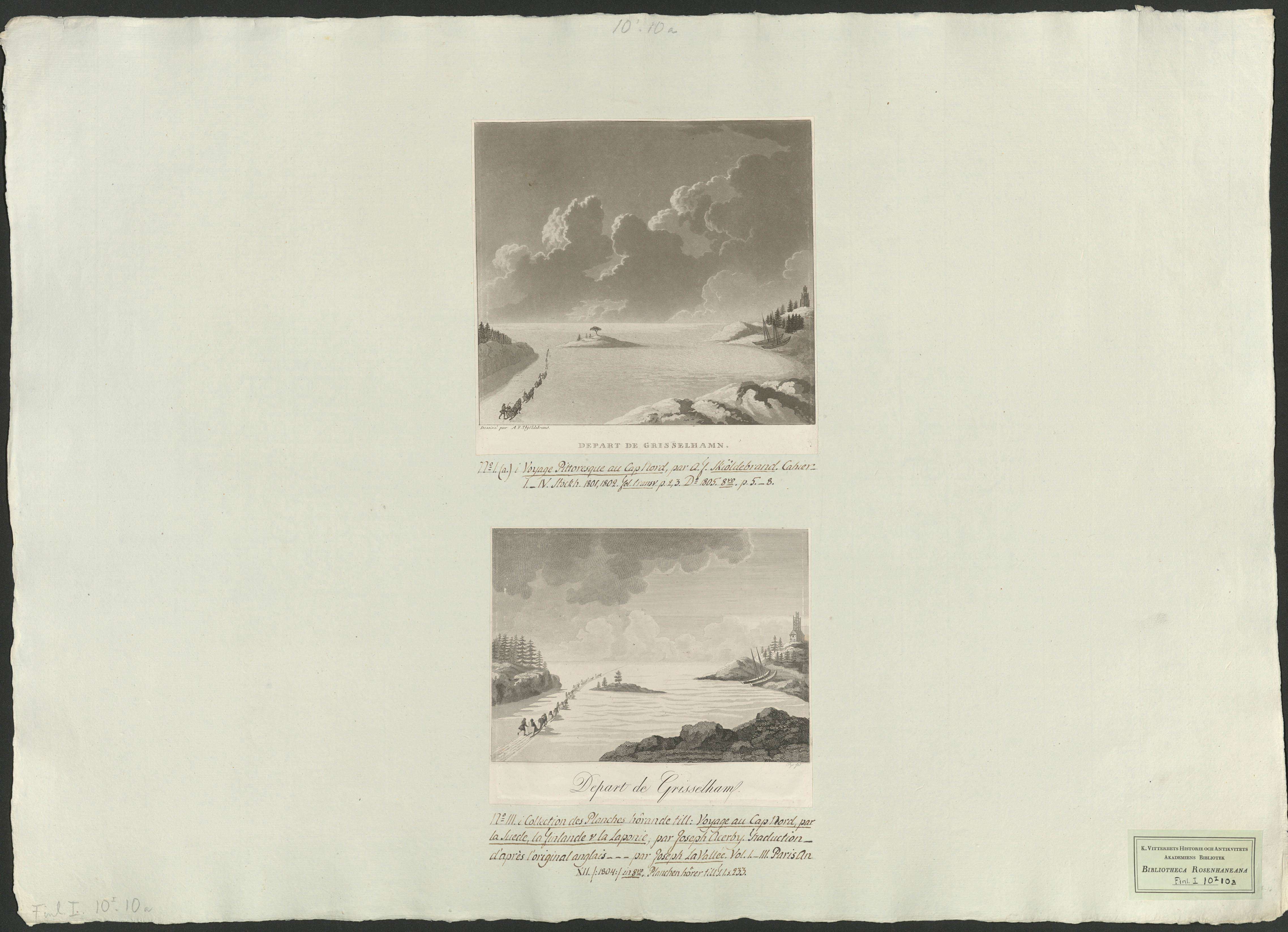 Beskrivning: 1 grafiskt bl. : Grisslehamns inlopp täckt med is. Ett slädparti på väg mot Åland. Dessiné par A. F. Skjöldebrand