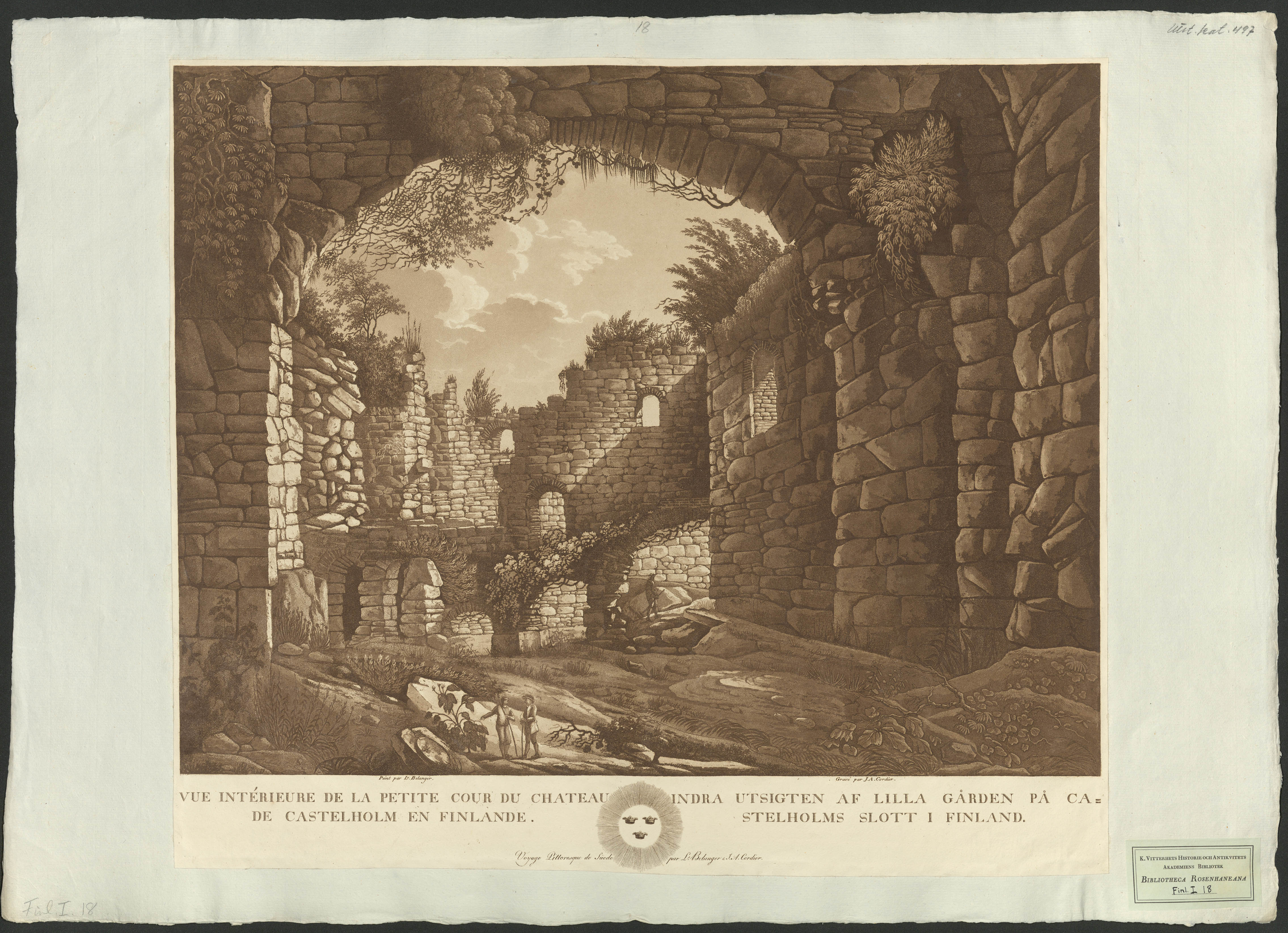 Beskrivning: 1 grafiskt bl. : Några män står inne i slottsruinen. Peint par L:s Belanger ; Gravé par J. A. Cordier.