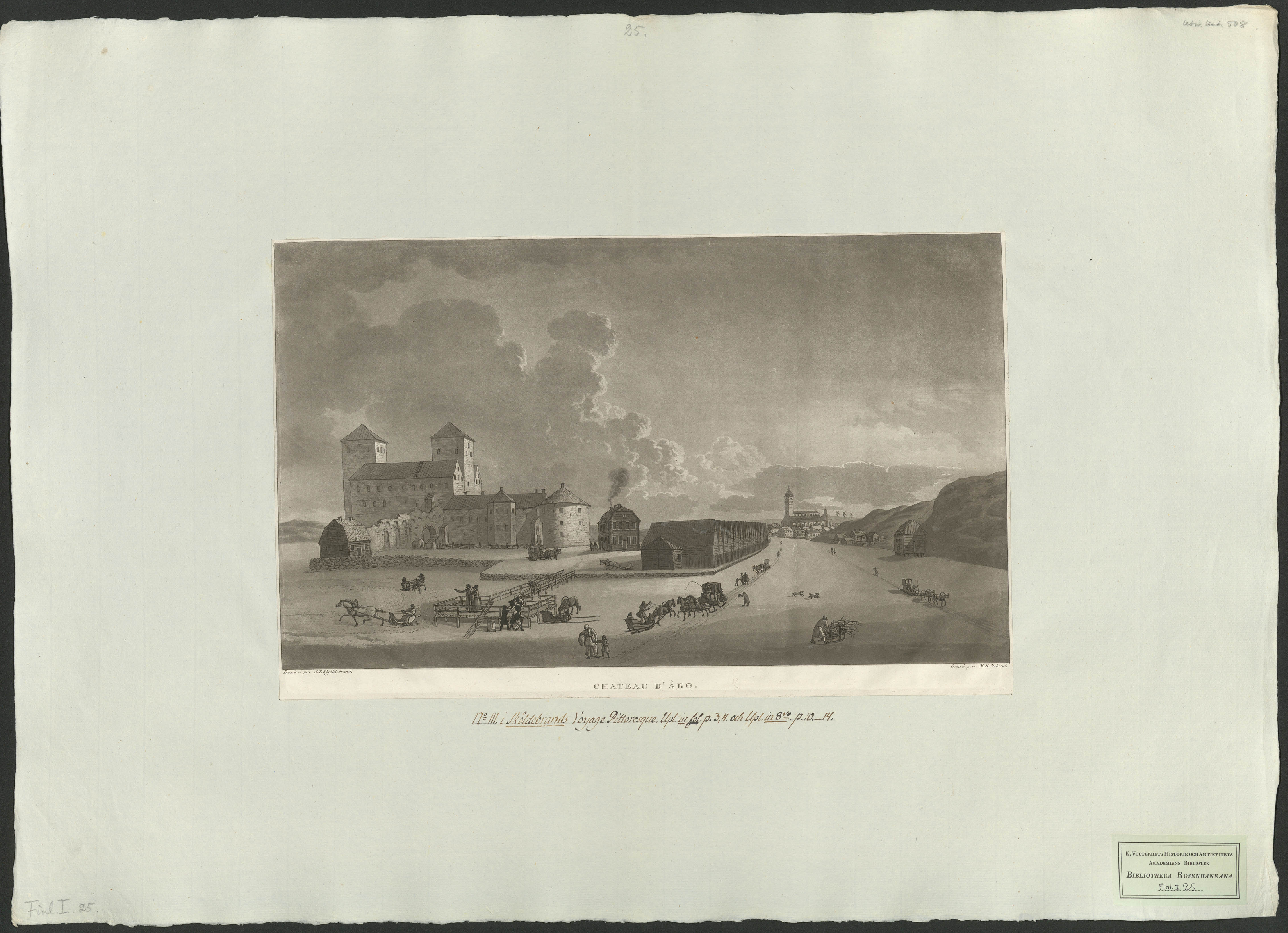 Beskrivning: 1 grafiskt bl. : Vy över Åbo slott. I förgrunden folkliv på isen. I bakgrunden domkyrkan. Dessiné par A. F. Skjöldebrand. ; gravé par M. R. Heland.