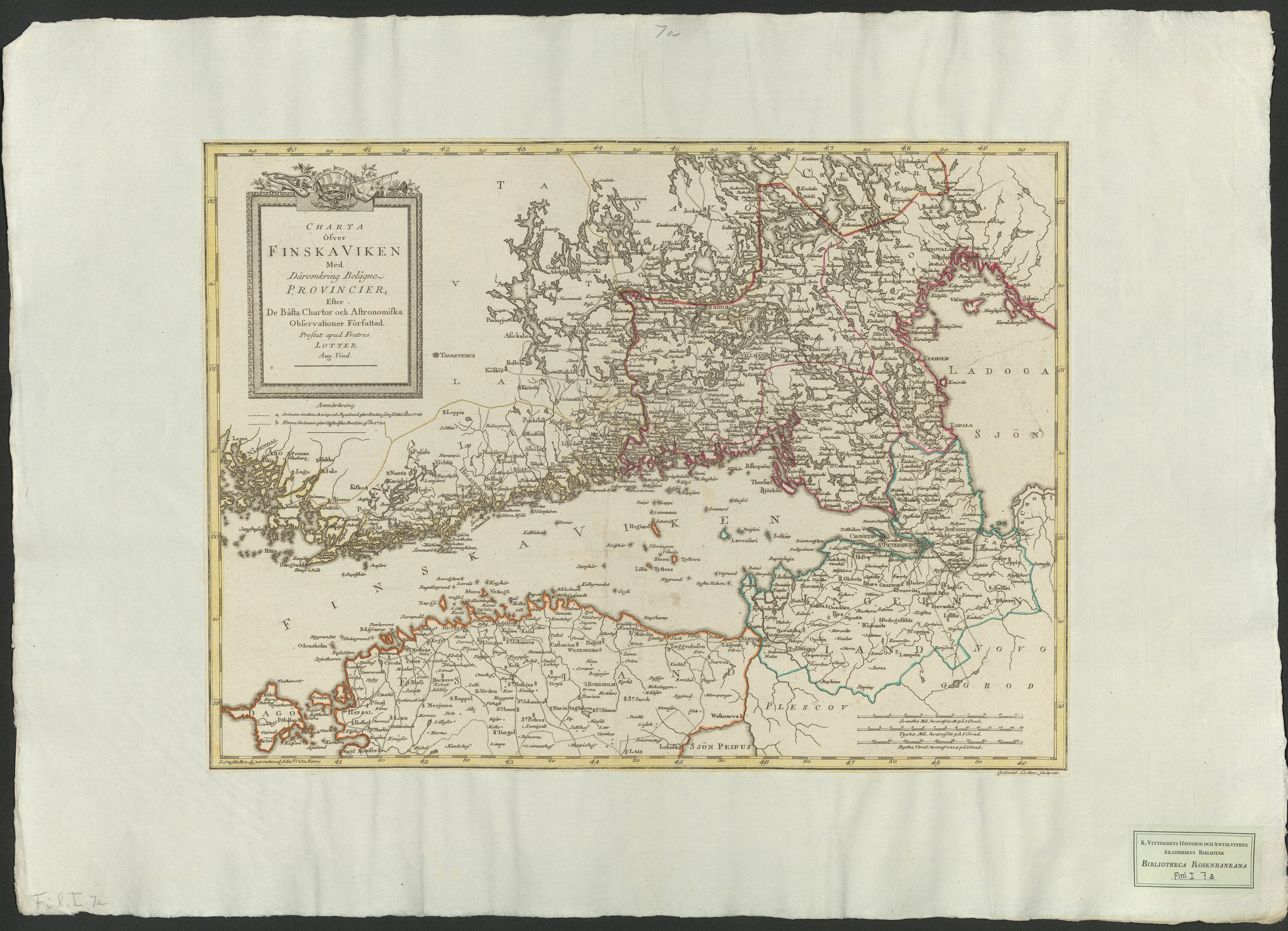 Beskrivning: 1 karta : Södra Finland och Finska viken. Visar gränserna mot Ryssland 1721 och 1743. Gabriel Lotter sculpsit