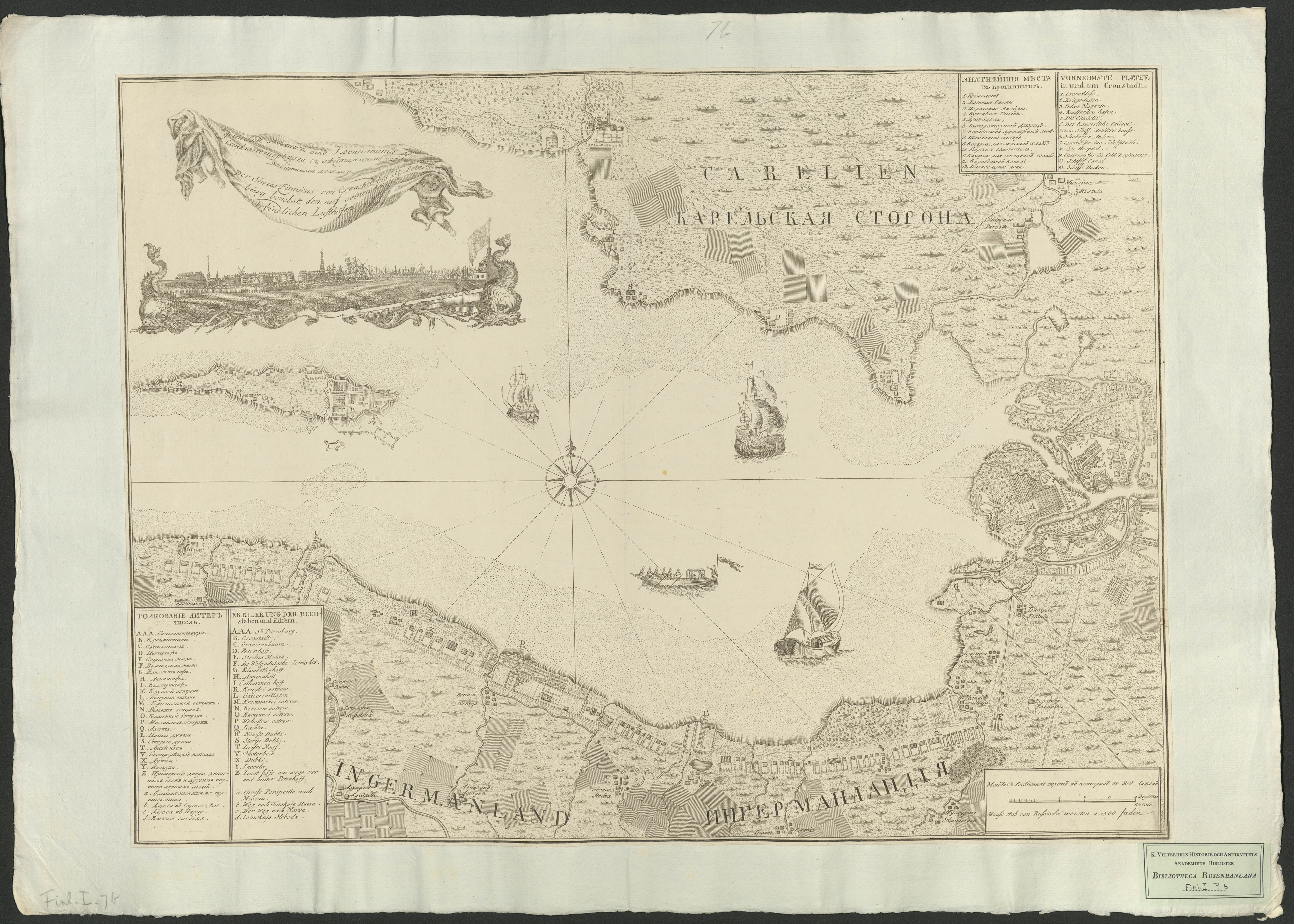 Beskrivning: 1 karta : Kartan visar Sankt Petersburgs stadsplan samt de kring Finska viken belägna sommarresidensen. Även en silhuett av Sankt Petersburg. Grimmel del.