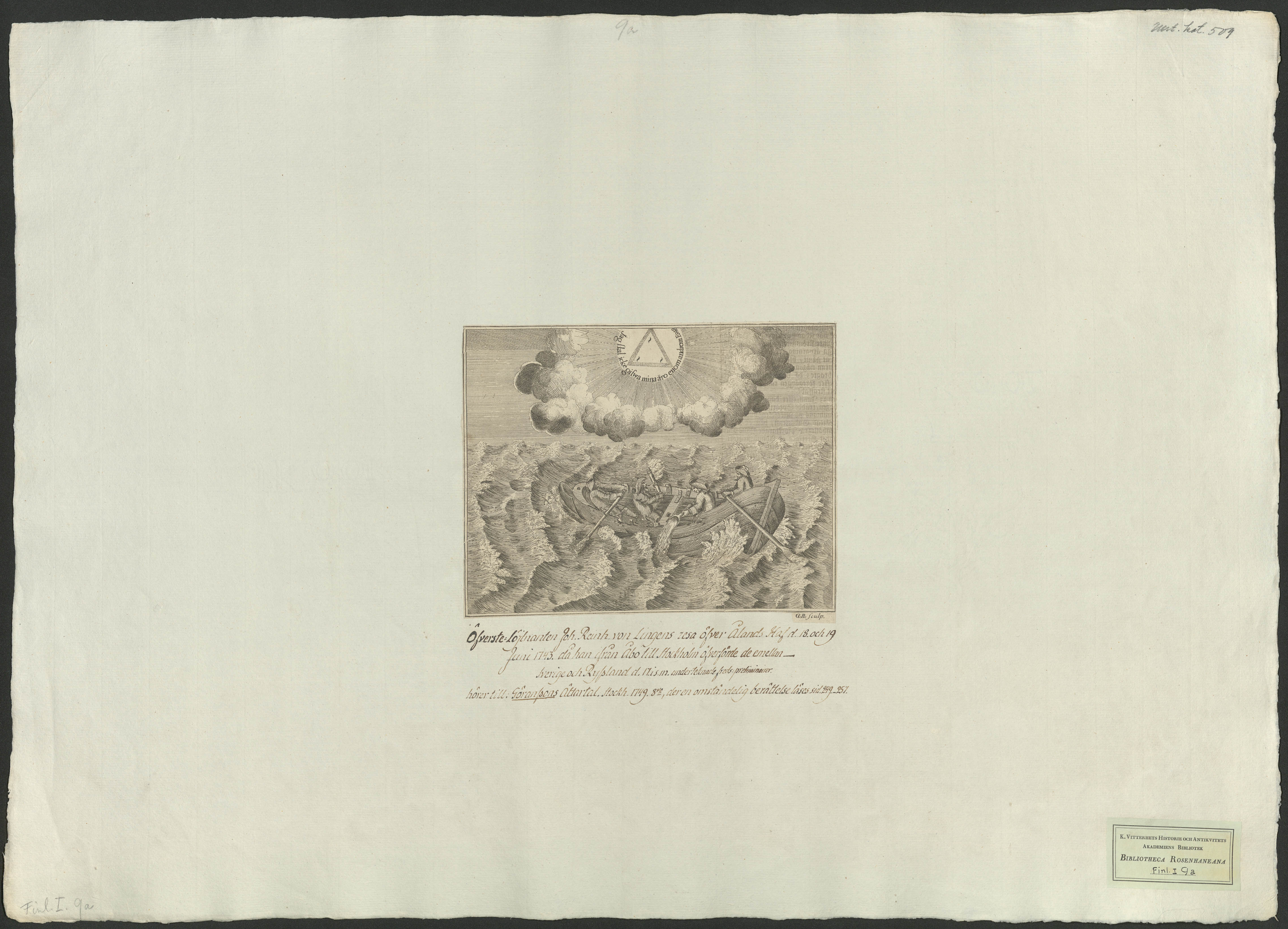 Beskrivning: 1 grafiskt bl. : Teckning av en liten skötbåt i storm. Tvä män ror, en man öser och en man styr. I himlen syns treenighetssymbolen med texten "Jag skal icke gifwa mina äro enom androm. Es.48." G.B. Sculp.