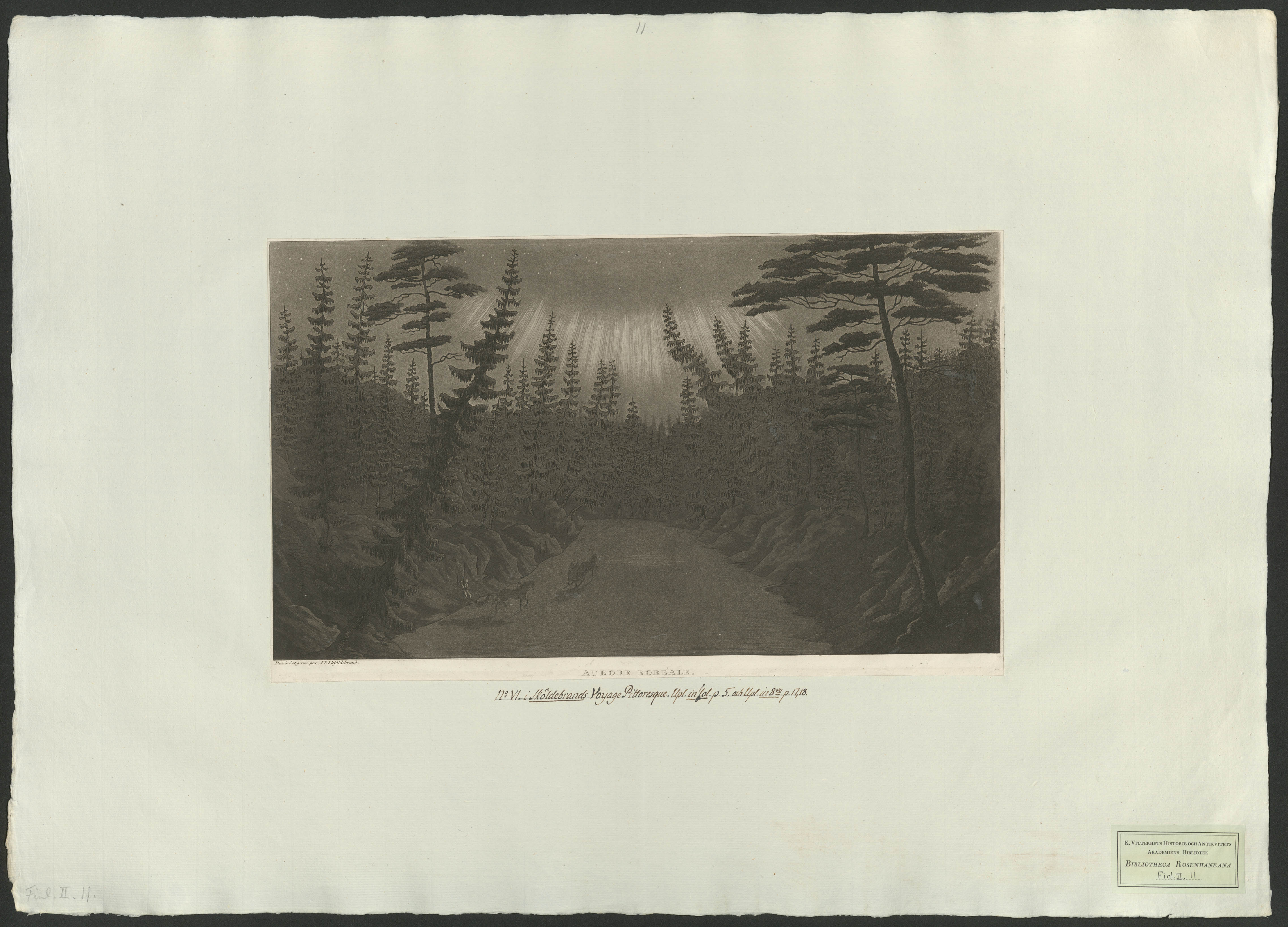 Beskrivning: 1 grafiskt bl. : Centralperspektiv med väg som försvinner in i en mörk skog, bakom vilken solen snart går upp. Dessiné et gravé par A. F. Skjöldebrand