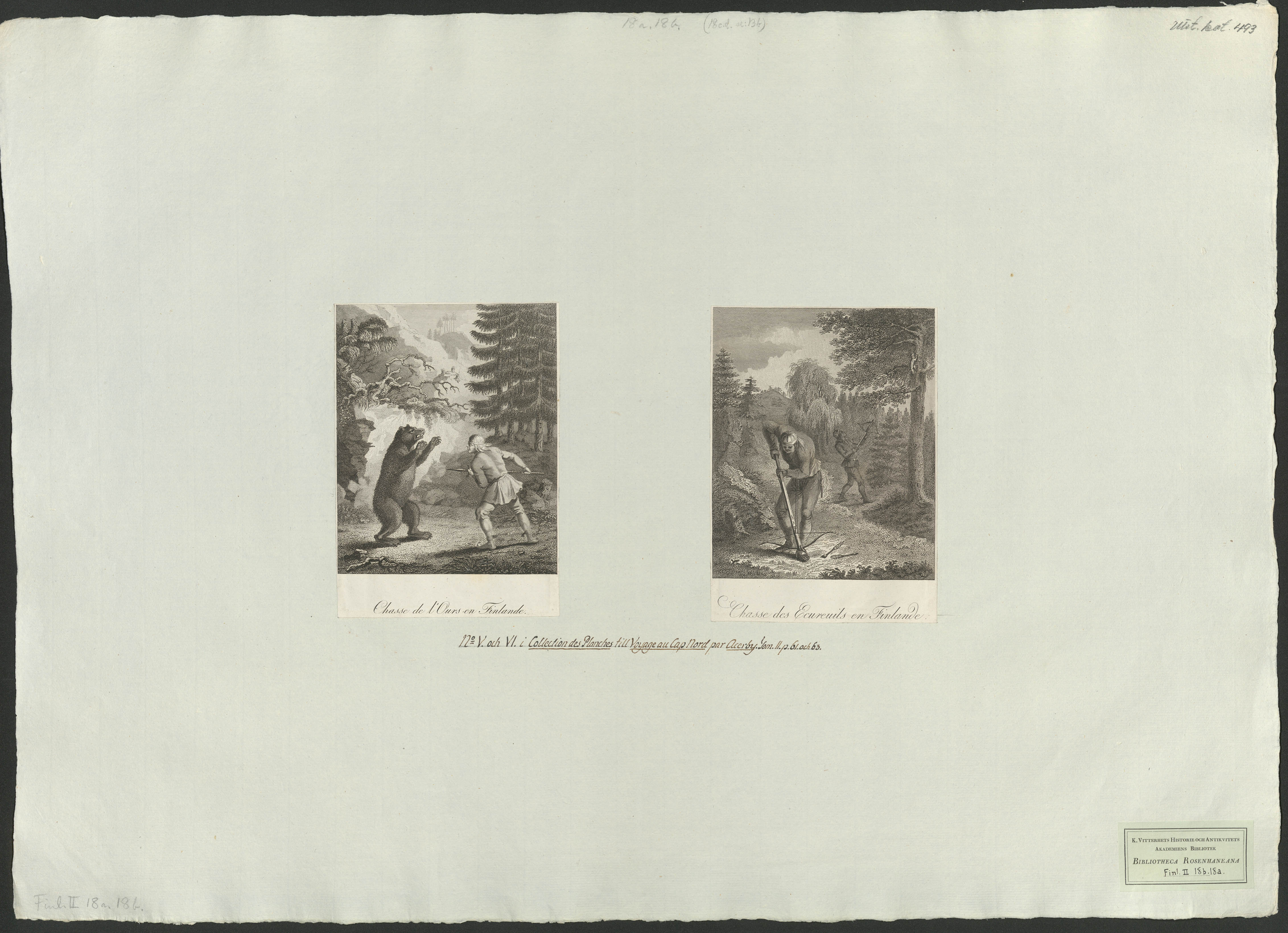 Beskrivning: 1 grafiskt bl. : En jägare i närstrid med en björn.