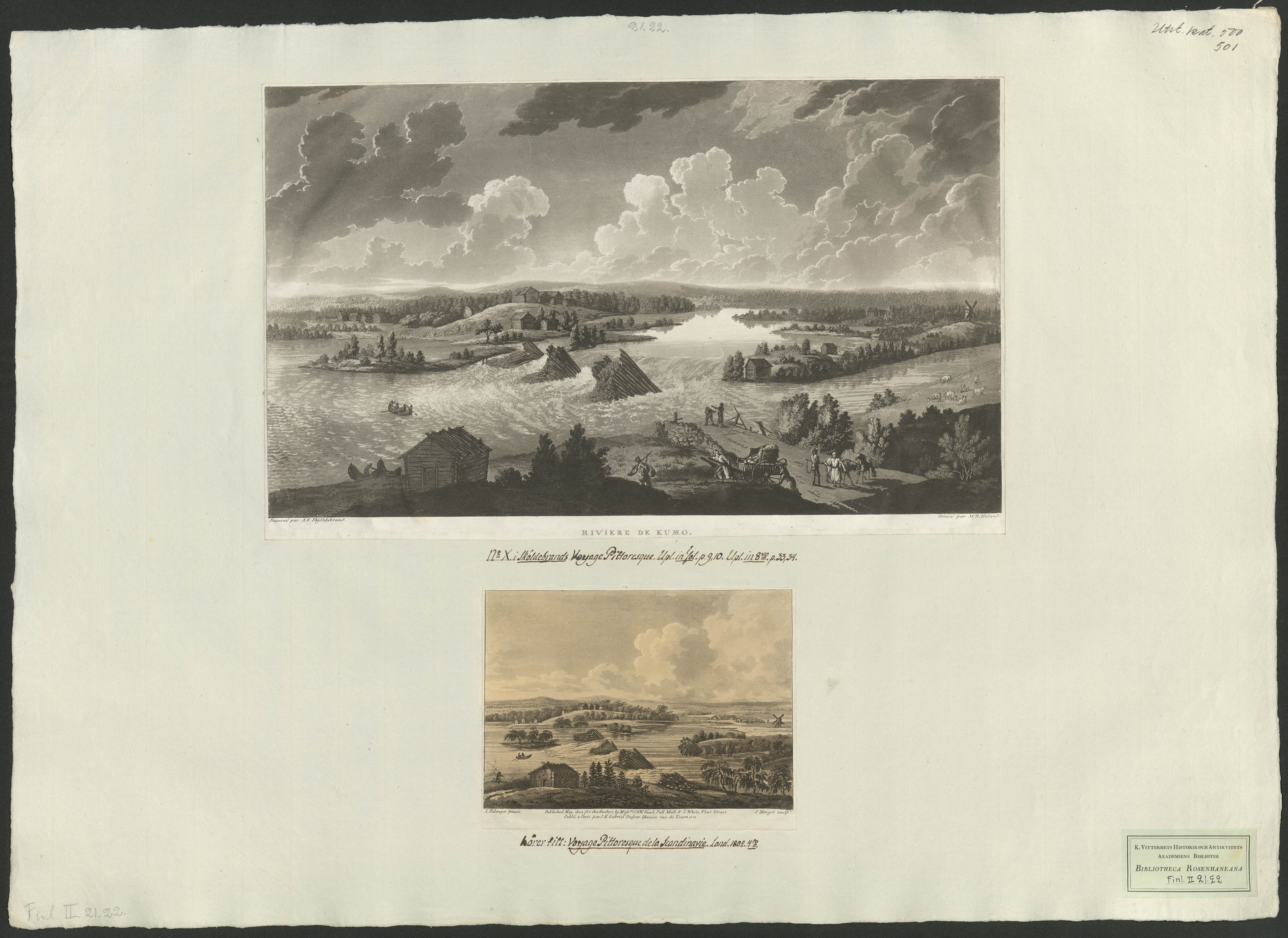 Beskrivning: 1 grafiskt bl. : Panorama över Kumo älv. Dessiné par A. F. Skjöldebrand ; Gravé par M. R. Heland.