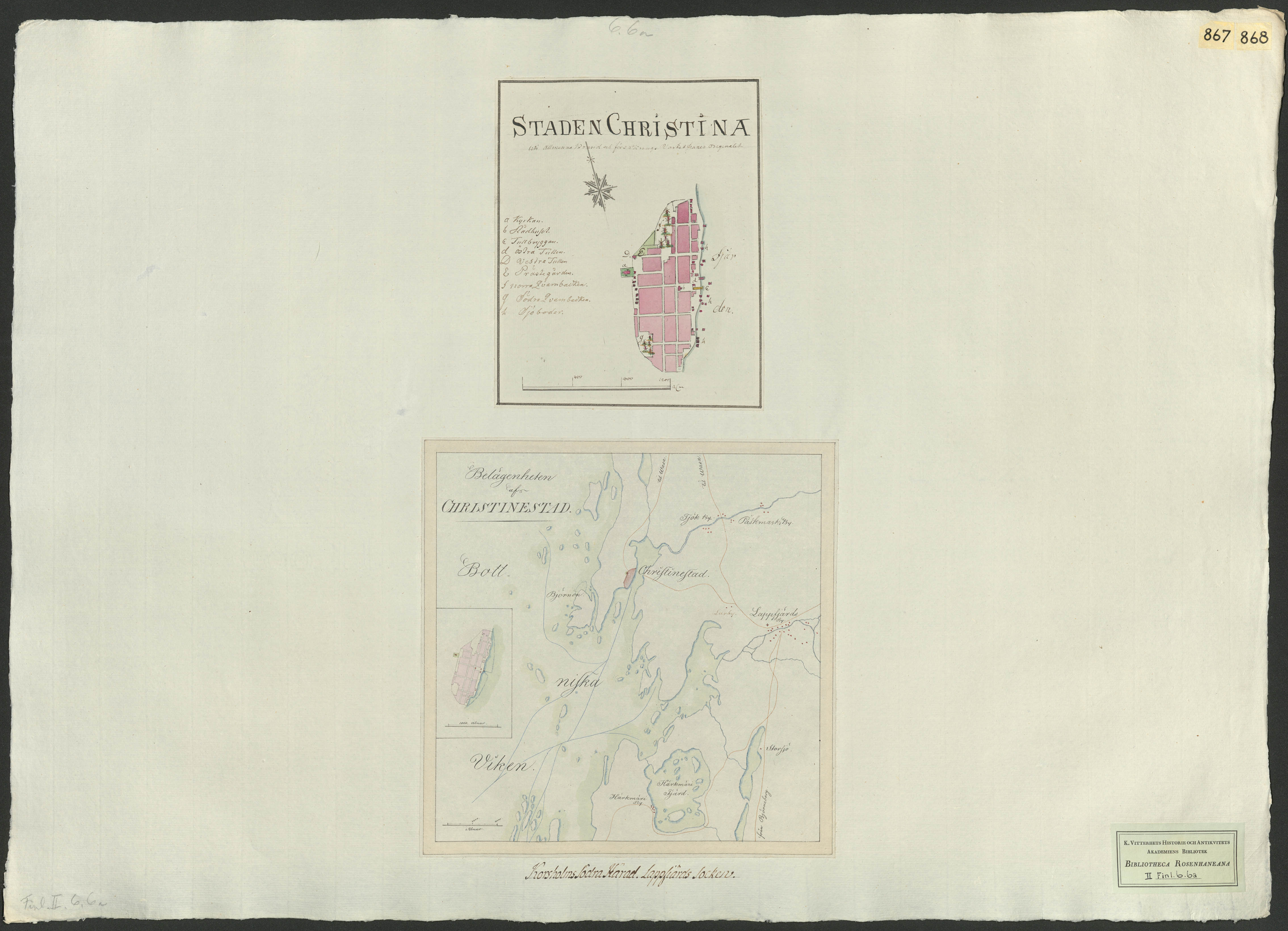 Beskrivning: 1 handritad karta : Stadskarta med kvarter och gator. Teckenförklaring. Skala ca 1:8 000.