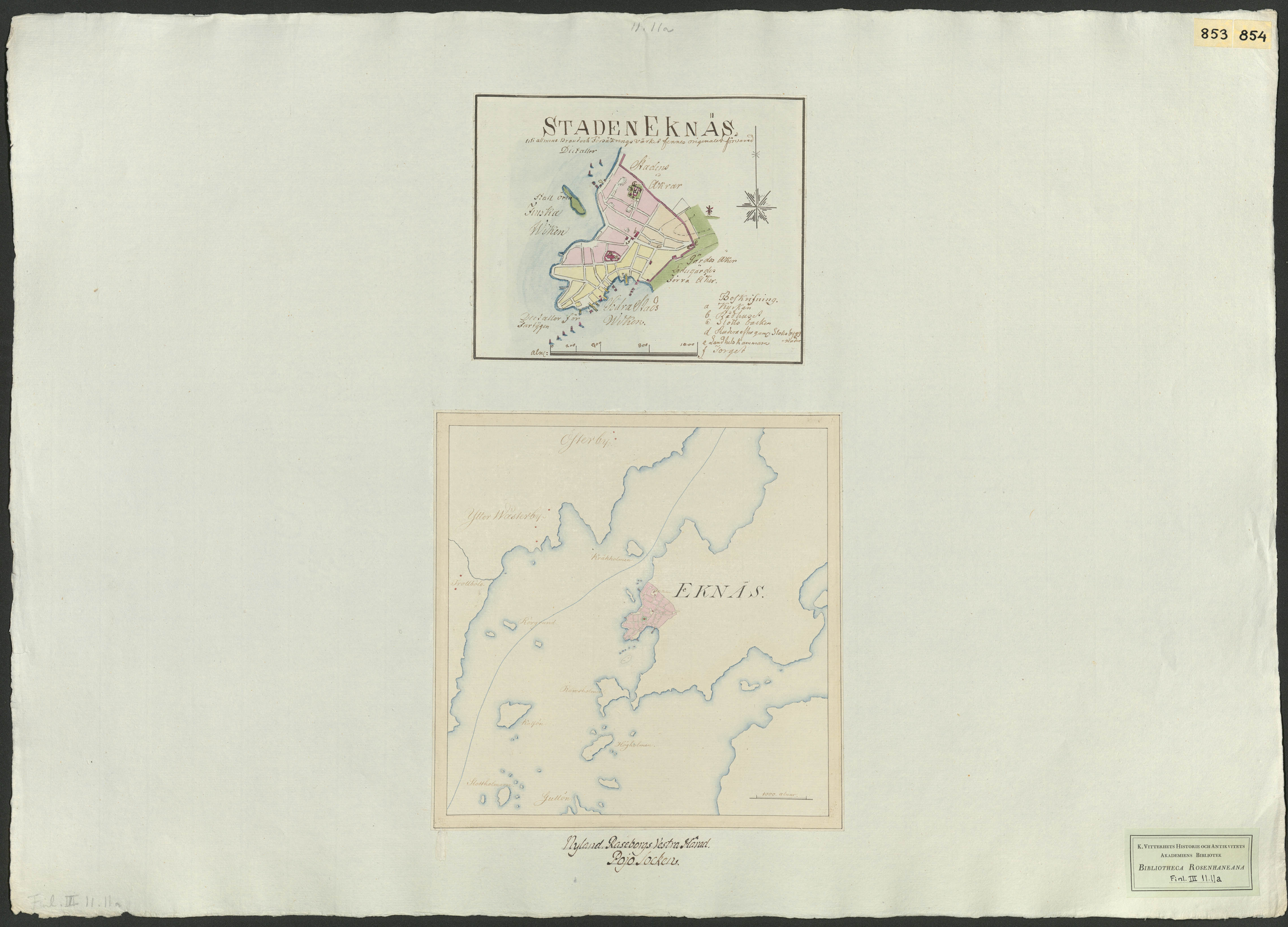 Beskrivning: 1 handritad karta : Stadskarta med kvarter, gator och åker. Teckenförklaring. Skala ca 1:8 000.