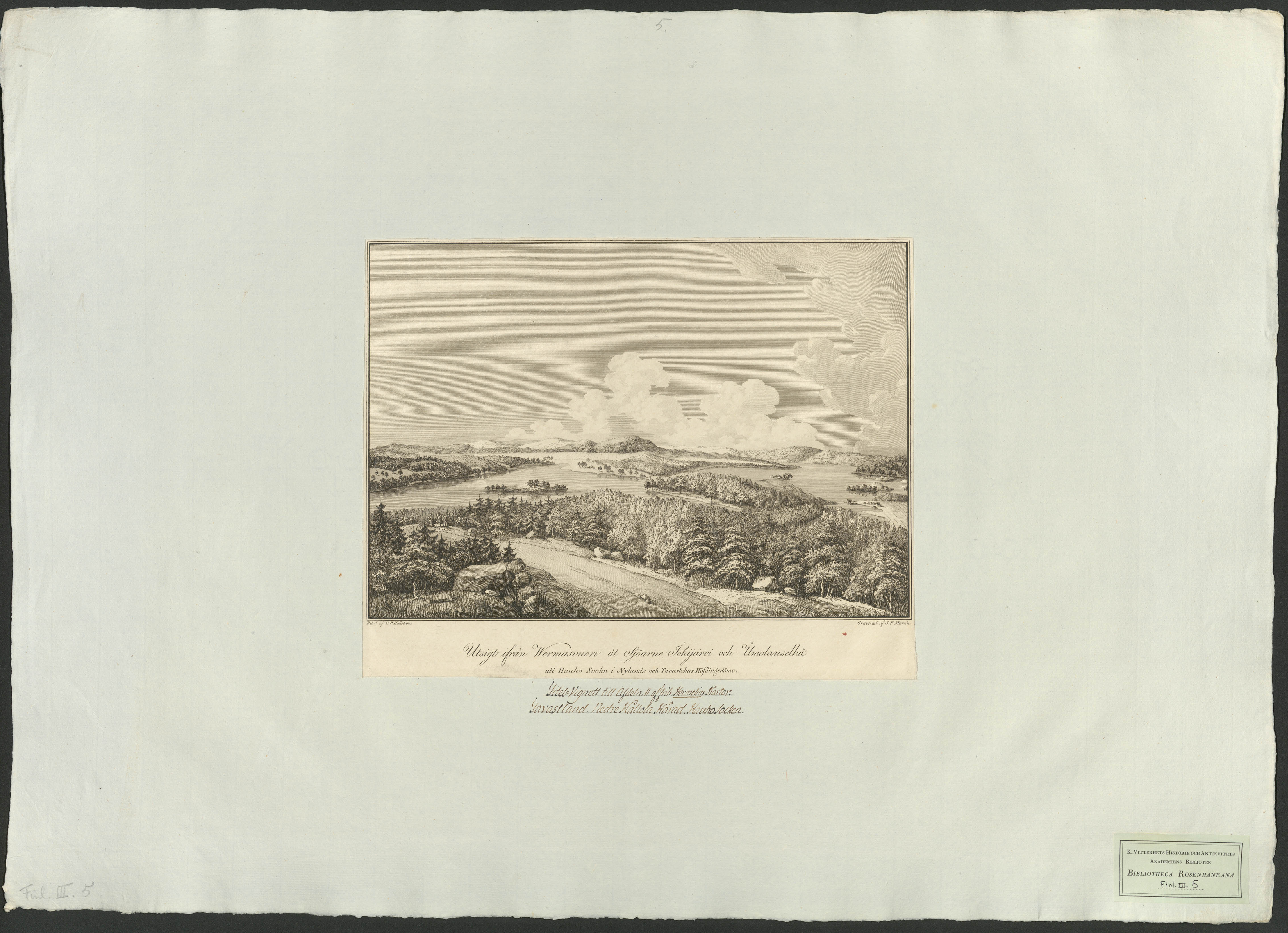 Beskrivning: 1 grafiskt bl. : Panorama över ett kuperat sjölandskap. Ritad av C. P. Hällström / graverad av J. F. Martin