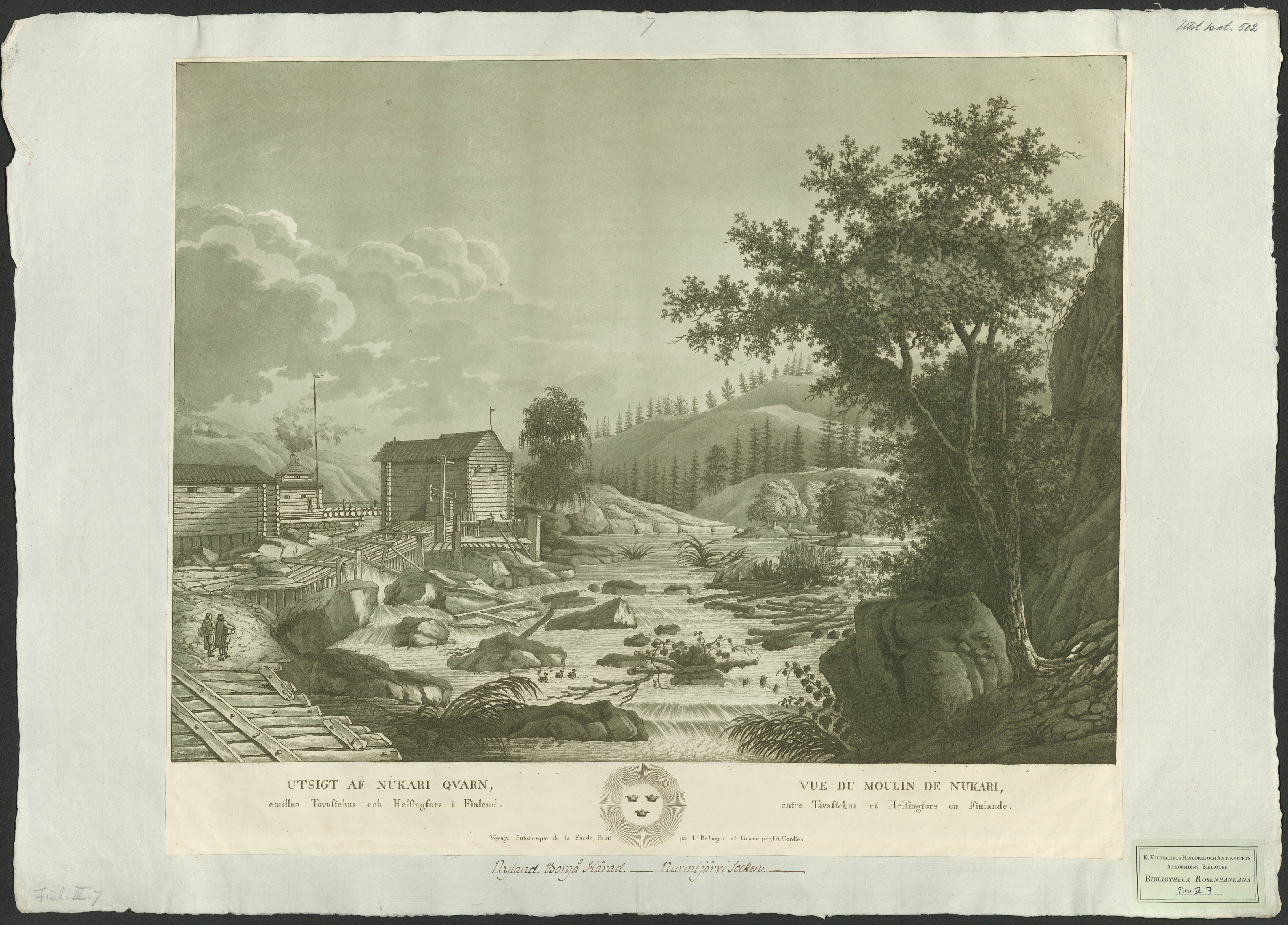 Beskrivning: 1 grafiskt bl. : Vy över en kvarnanläggning i en fors. Peint par L. Belanger et gravé par J. A. Cordier