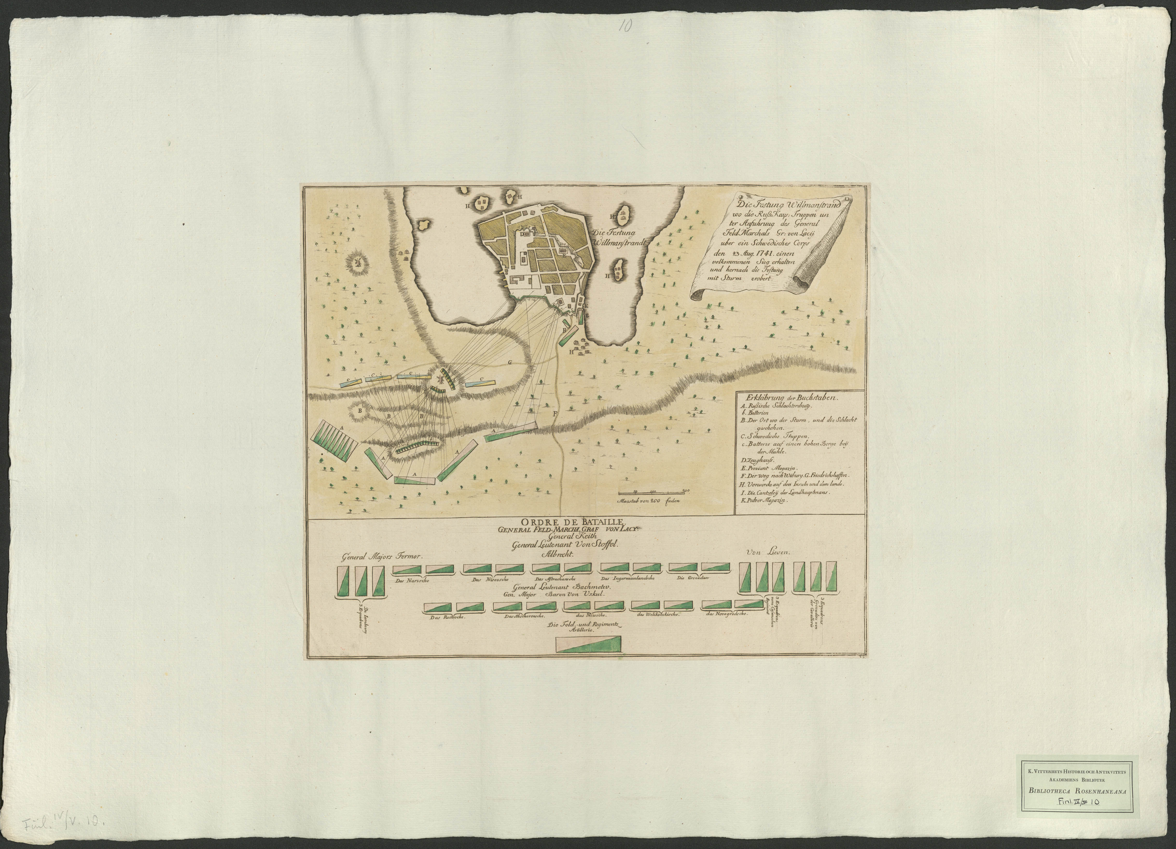 Beskrivning: 1 handritad karta : Karta över truppernas uppställning utanför staden och fästningen. Därunder en schematisk "Ordre de Bataille"