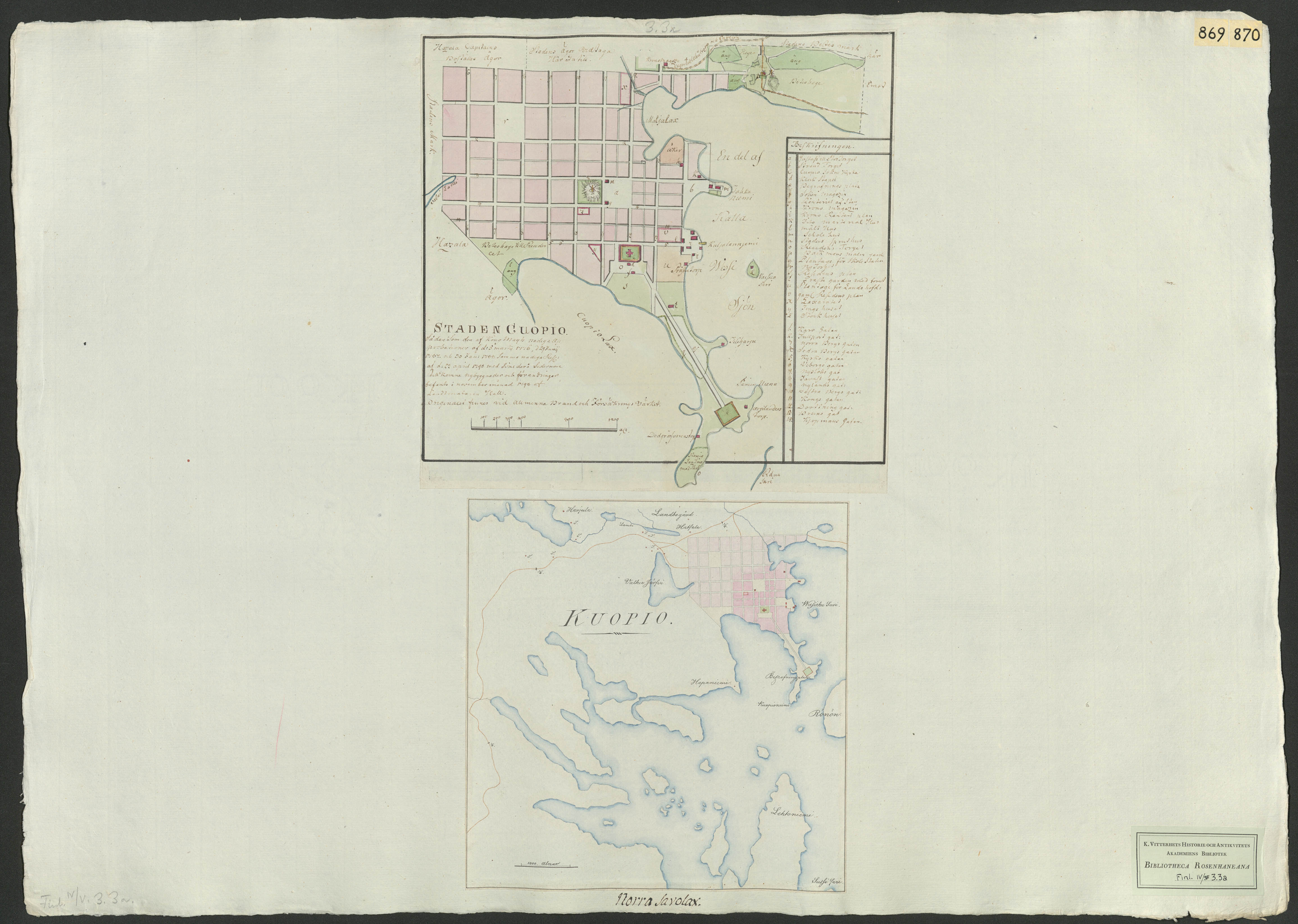 Beskrivning: 1 handritad karta : Stadskarta med kvarter och gator samt stadens åker och äng. Teckenförklaring. Skala ca 1:8 000.