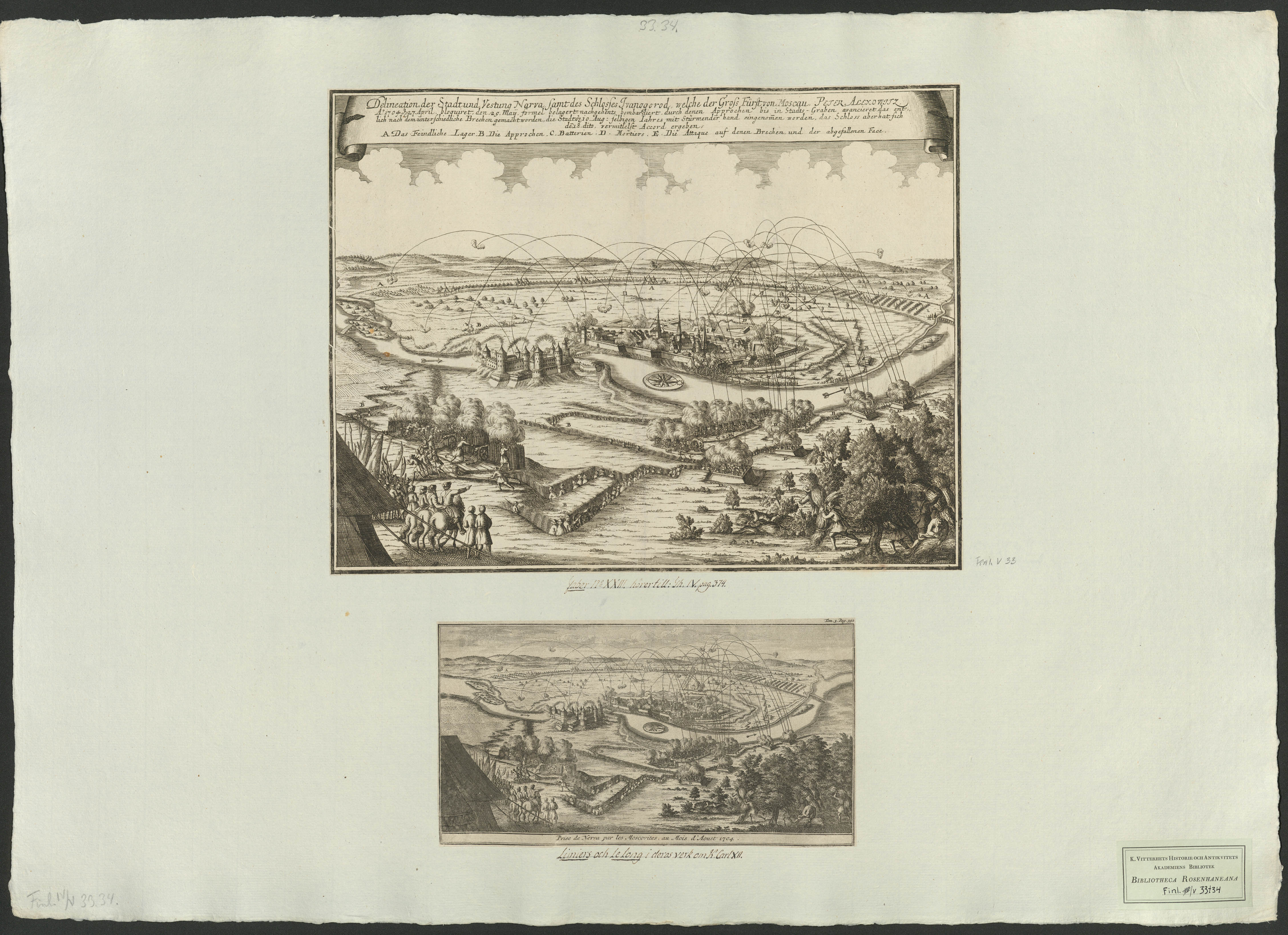 Beskrivning: 1 grafiskt bl. : Vy över Narva under bataljen. I förgrunden ryska ställningar.