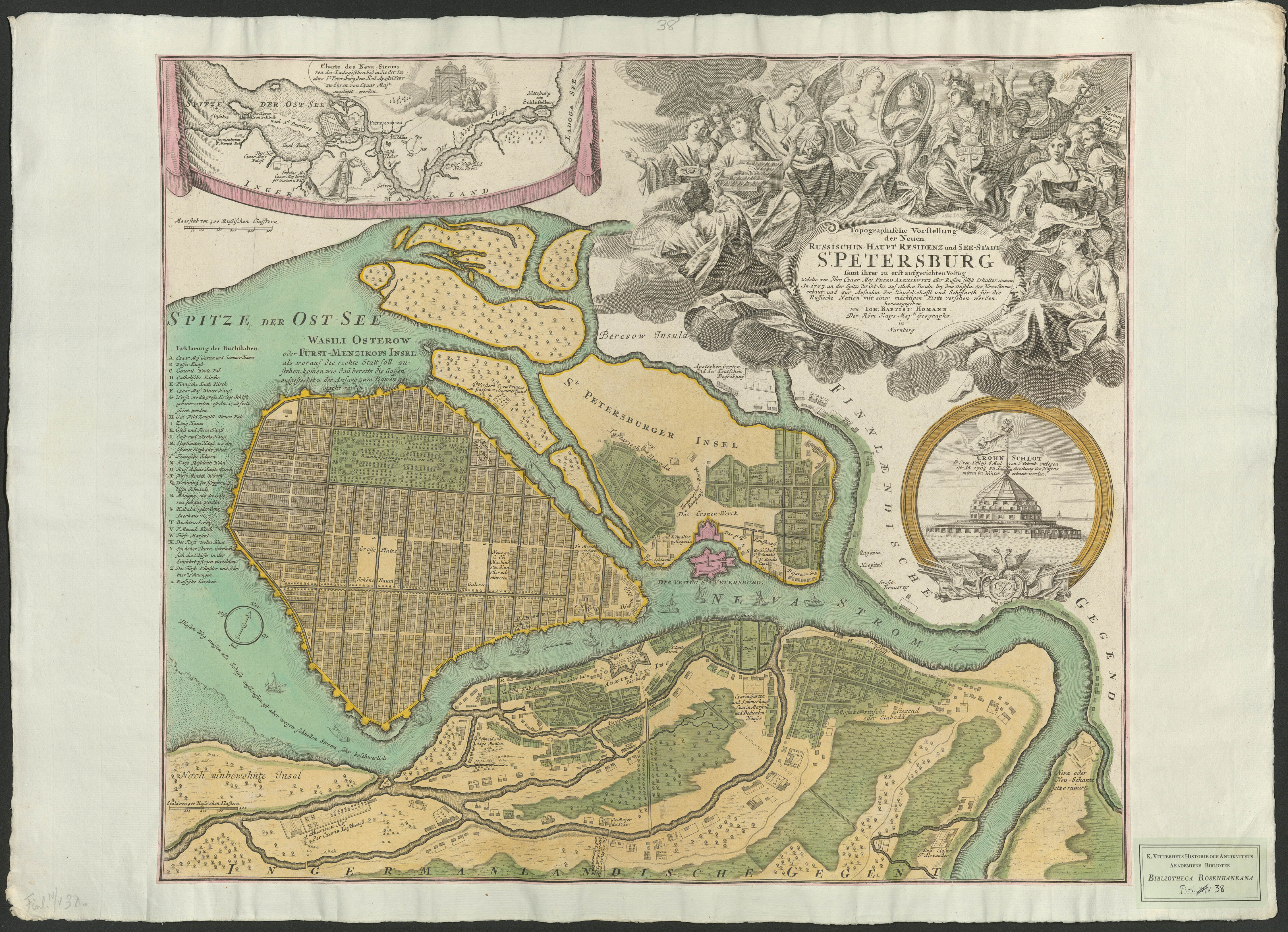 Beskrivning: 1 karta : Karta över staden med närmaste omnejd. Teckenförklaring. Infälld småskalig special över över Nevas dalgång mellan Finska viken och Ladoga.